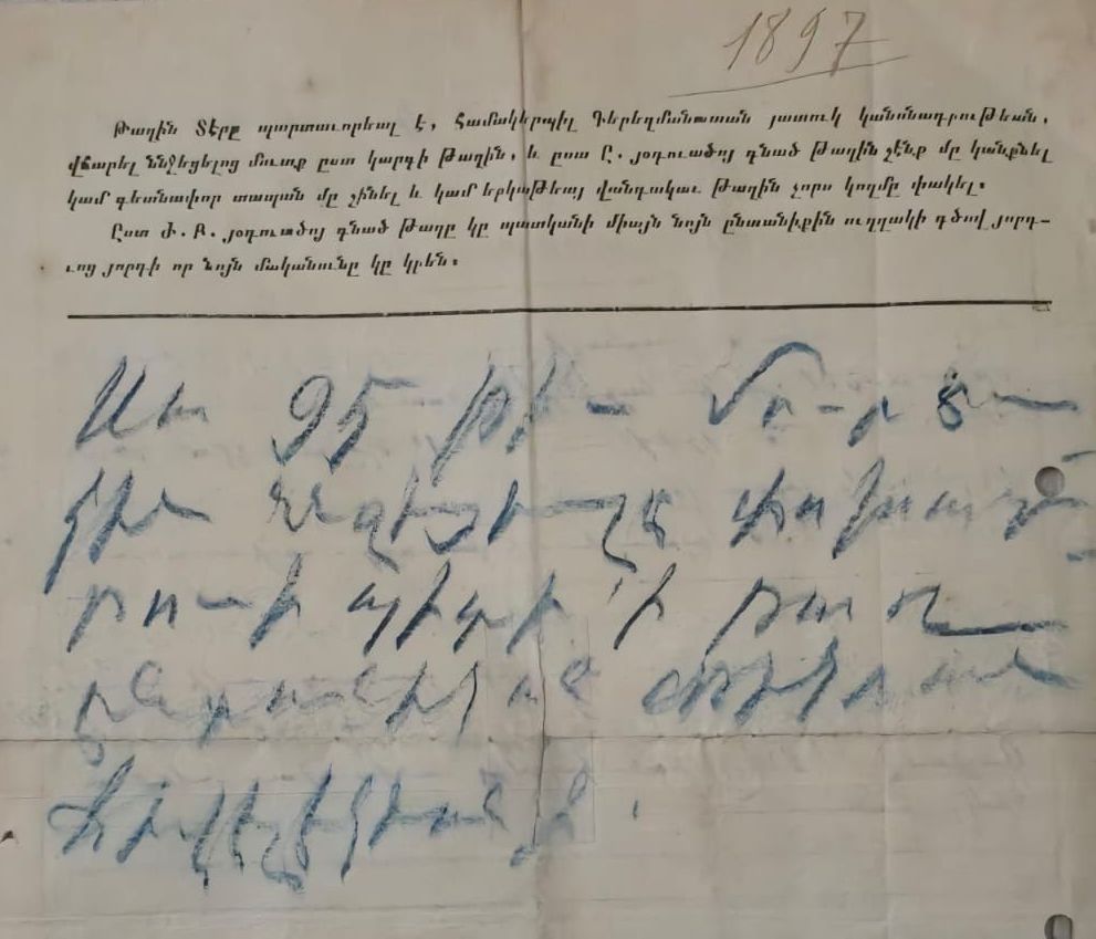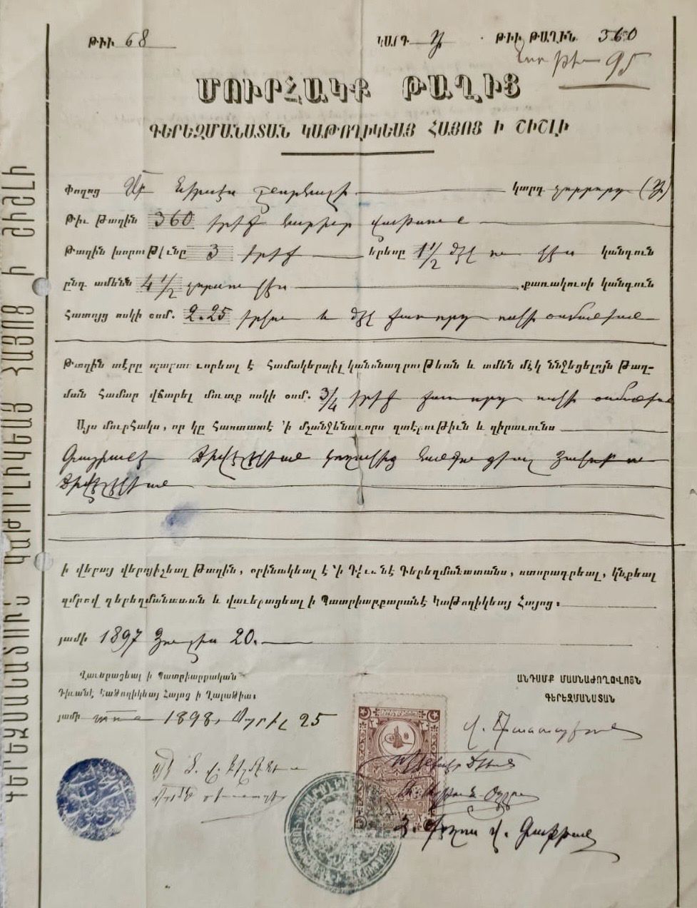 Document from 1897/8 relating to the ownership of a plot of land designated for burial—a grave. It pertains to the Armenian Catholic Church’s cemetery in Şişli. Notably, the cemetery is organized into “streets”; for instance, the plot in question is located on St. Nerses Shnorhali Street. The deed records a payment of 2.25 gold coins, and the dimensions of the grave are also specified. The payment was made by Gayane Jivelekian for her late husband, Hagop Jivelekian.Created By
