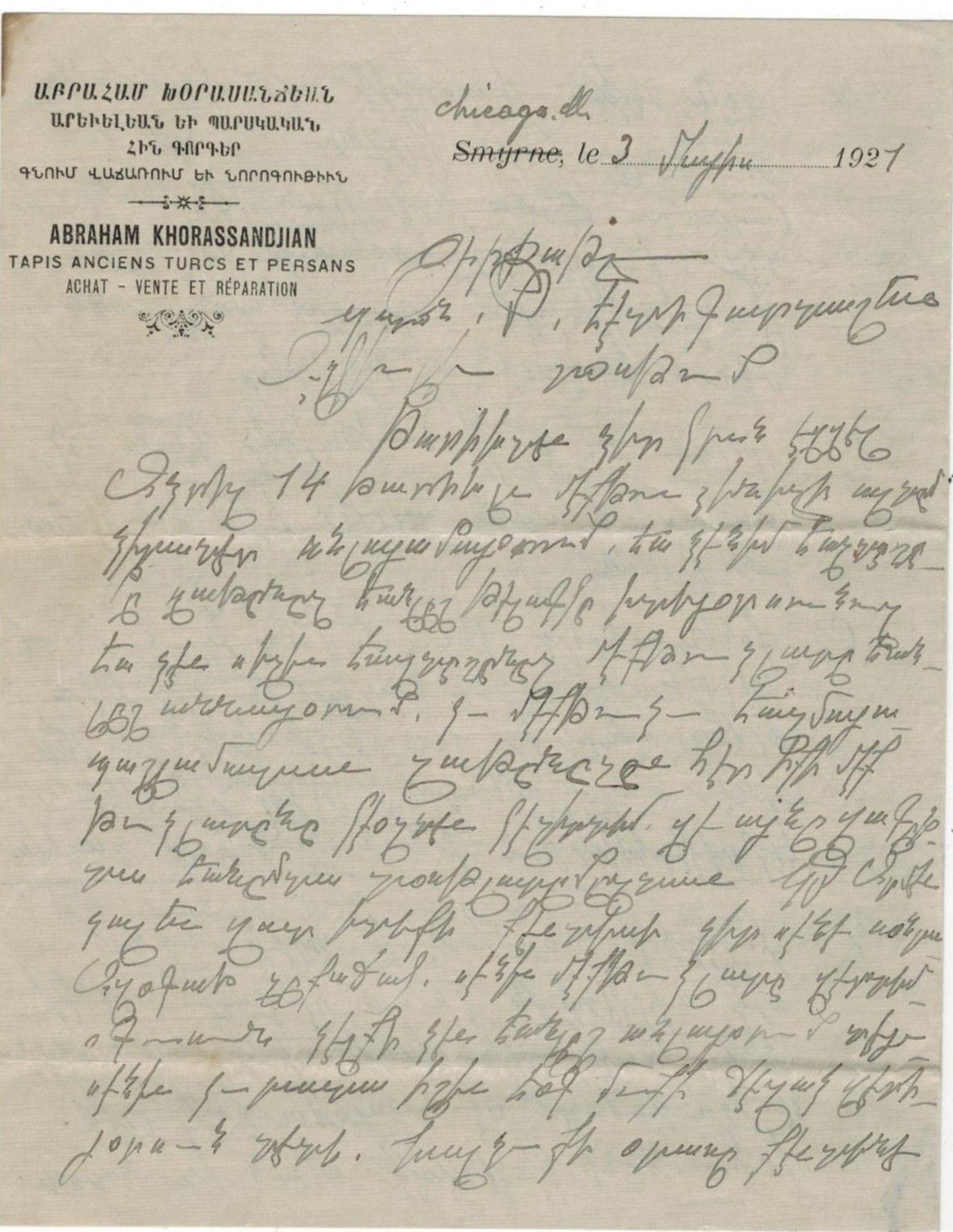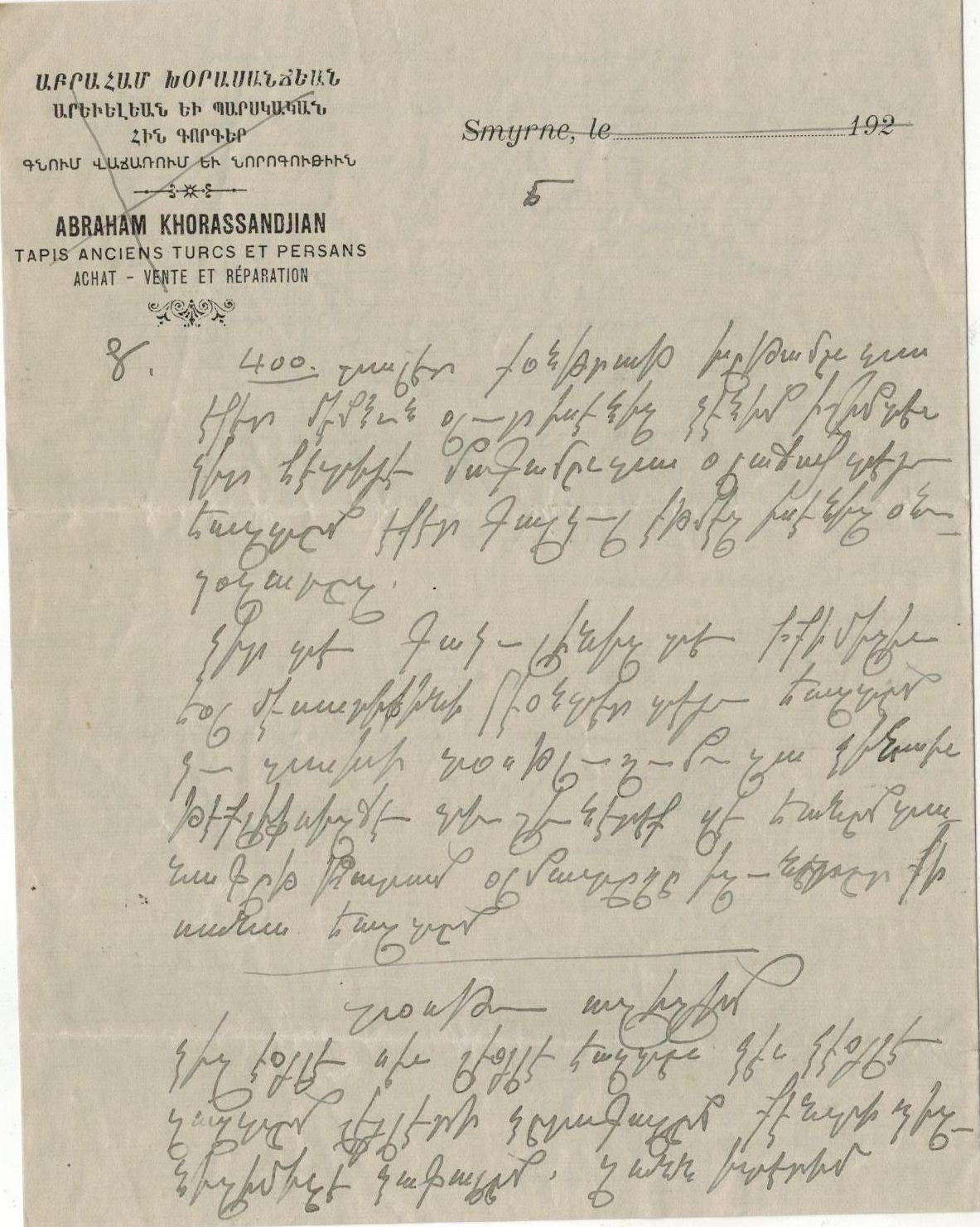 Abraham Khorassandjian was born in Gesaria (Kayseri) in 16 March 1884 (Mark Aslan erroneously lists his birthplace as Sivas). His Smyrna address, listed on his letterhead as Passage Boskovich No. 18 off the prestigious Rue Franque, does not appear on the Goad map of 1905 or in the Annuaire Oriental of 1913. This suggests that Khorassandjian likely moved to Smyrna after the Armenian Genocide, continuing his involvement in the carpet trade—a profession he likely practiced in Gesaria.