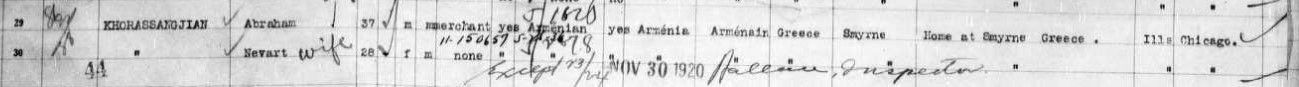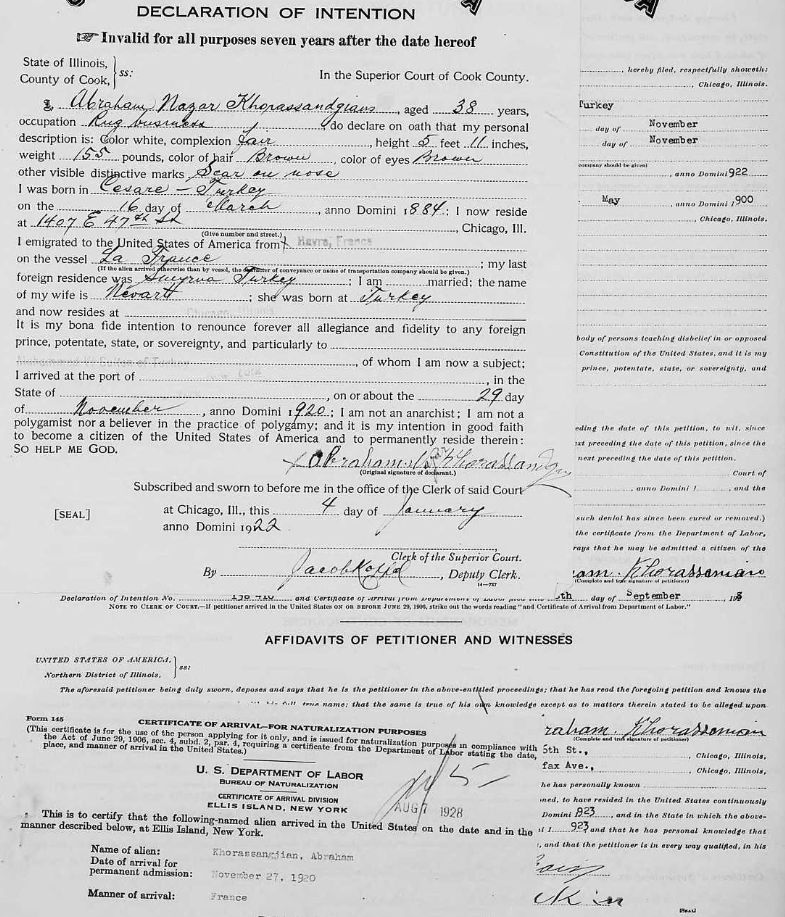 Khorassandjian made his way to the United States via France in November 1920, ultimately settling in Chicago, IL. There is also evidence linking him to an address in Racine, WI. He eventually established himself in Pasadena, CA, at 1622 N. Lake Ave., where he worked as a carpet repairer at the Mardigian S. M. Co. carpet store located at 827 E. Colorado Blvd.