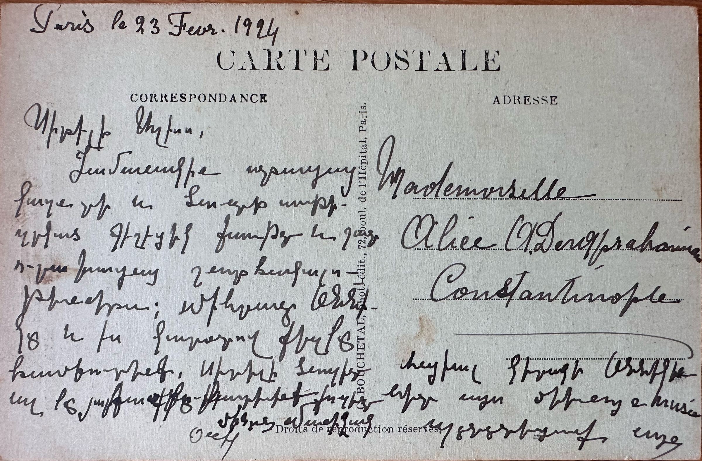 I was very happy for receiving the beautiful New year and Christmas card that you sent me, thank you. Mihran, Onnik and I send you kisses, we miss you. We send our regards to your parents.