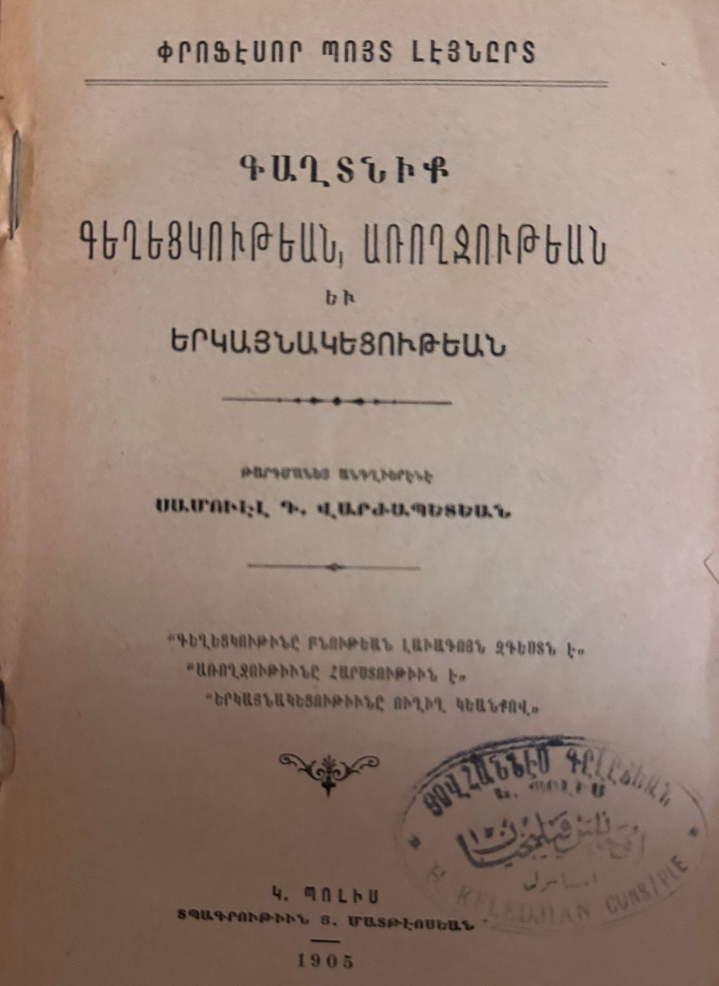 Kaghnik Keghetsgutian, Aroghjutian, ev Ergaynagetsutiun (Boyd Leonard, 1905)Description