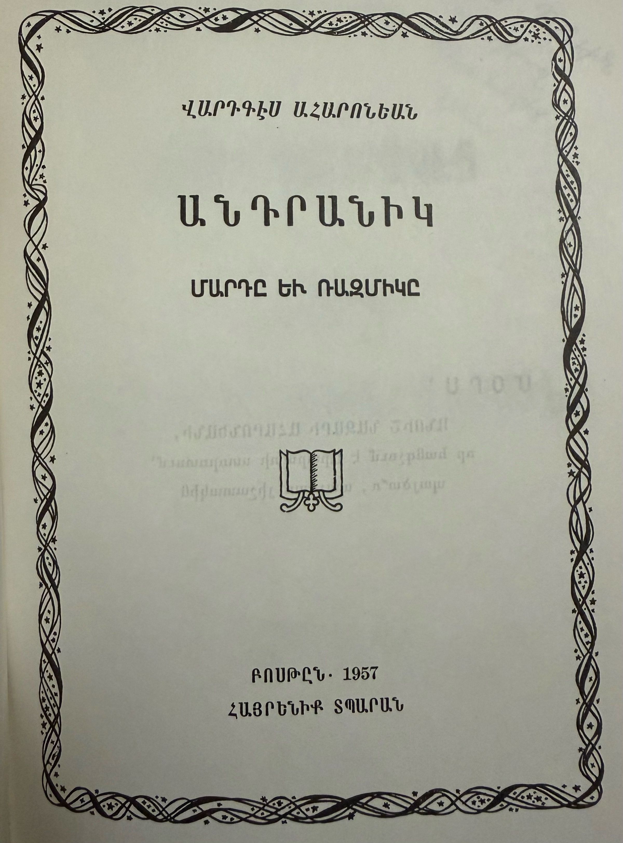 Aharonian is also the author of Antranig: Marte yev Razmige (Andranik: The Man and the Warrior), a biographical and memoir-based work first published in 1957 in Boston by the Hairenik Association and republished in the 21st century by the Hamazkayin Armenian Educational and Cultural Society. The book, which remains relatively little known in Armenia and among historians of the period, draws on Aharonian’s personal experiences as a volunteer aide-de-camp and interpreter to General Andranik during the First World War, including his involvement in the Armenian Volunteer Movement. Having encountered Andranik frequently both within his family environment and during wartime service, Aharonian presents a firsthand account of the general’s military leadership and personal character, portraying him as both a military figure and a complex individual. The memoir emphasizes aspects of Andranik’s personality and conduct not always reflected in official or later historical narratives, and functions as a primary source on the events of the period and the lived experience of one of the Armenian national movement’s most significant figures, whose political affiliations and legacy were downplayed during the Soviet era. The book is dedicated to the memory of the author’s mother, Anush Nazari Aharonian, with the inscription: “To the shining, shining memory of my mother, Anush Nazari Aharonian, who rests on the skirts of Mount Ararat.”Book Details