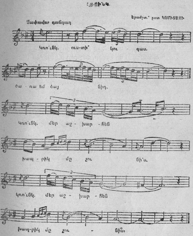 “Krunk” (meaning “Crane” in Armenian) is one of the most enduring and emotionally powerful pieces associated with Komitas Vardapet, the pioneering Armenian priest, composer, and ethnomusicologist who devoted his life to preserving Armenian folk music. While Komitas did not compose the lyrics, he collected and arranged the song in the early 20th century, transforming it into a refined art song while remaining faithful to its folk roots. His arrangement, typically for voice and piano or a cappella performance, is known for its haunting modal melody, subtle harmonic texture, and emotional depth—hallmarks of Komitas’s approach to sacred and vernacular music.