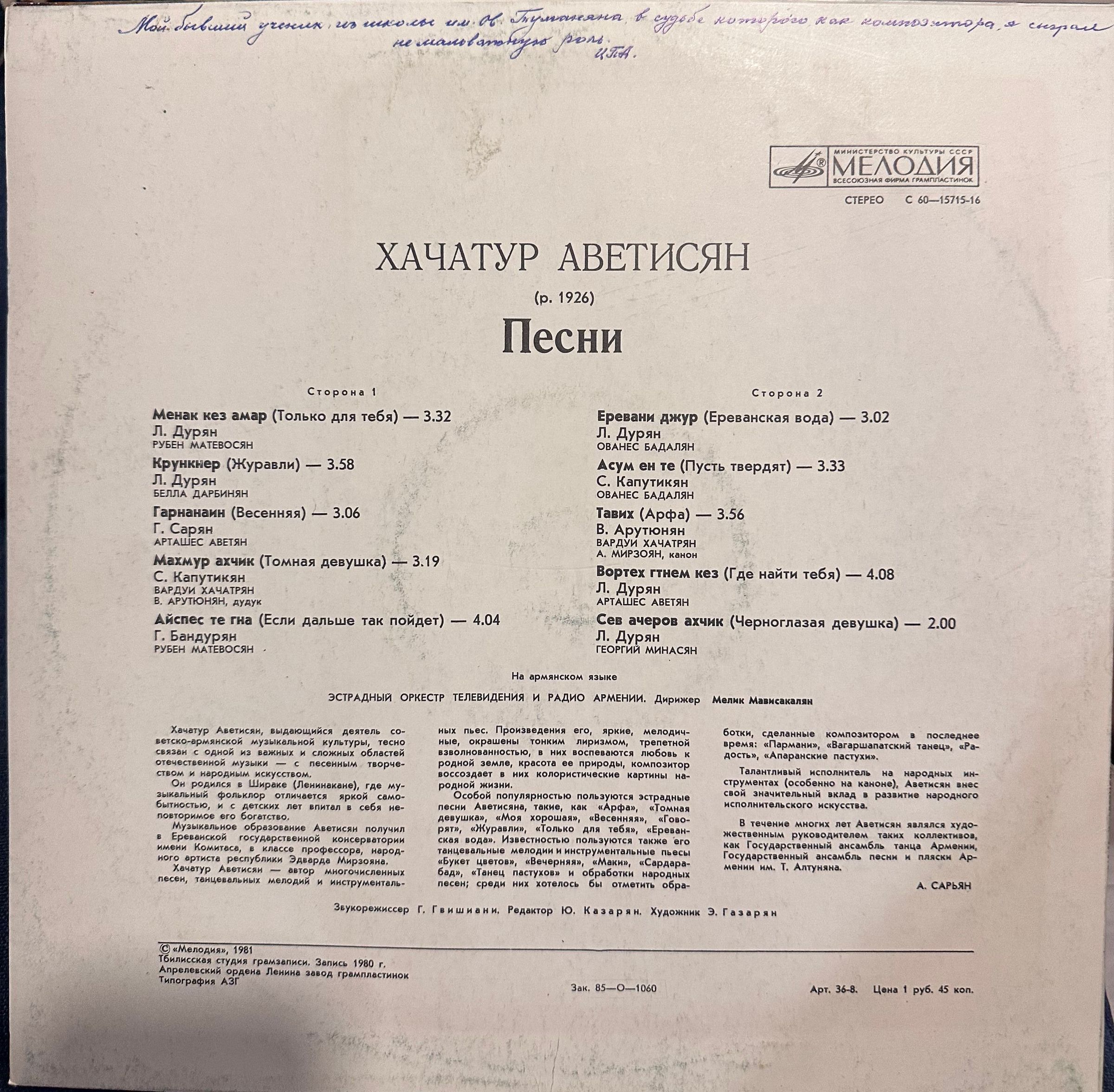 Khachatur Mekhaki Avetisyan (14 April 1926-1996) was a composer and authority on Armenian folk music, particularly the kanun. He graduated from Yerevan State Musical Conservatory and won gold medals in international competitions by age 25. In 1954, he composed the first Concerto for Kanun and Symphony Orchestra. Avetisyan founded the folk music department at the Komitas Conservatory in 1978, training a generation of musicians. He also served as artistic director of the Armenian National Dance Ensemble and the Tatul Altunyan Ensemble, contributing significantly to Armenian music.Audio Format