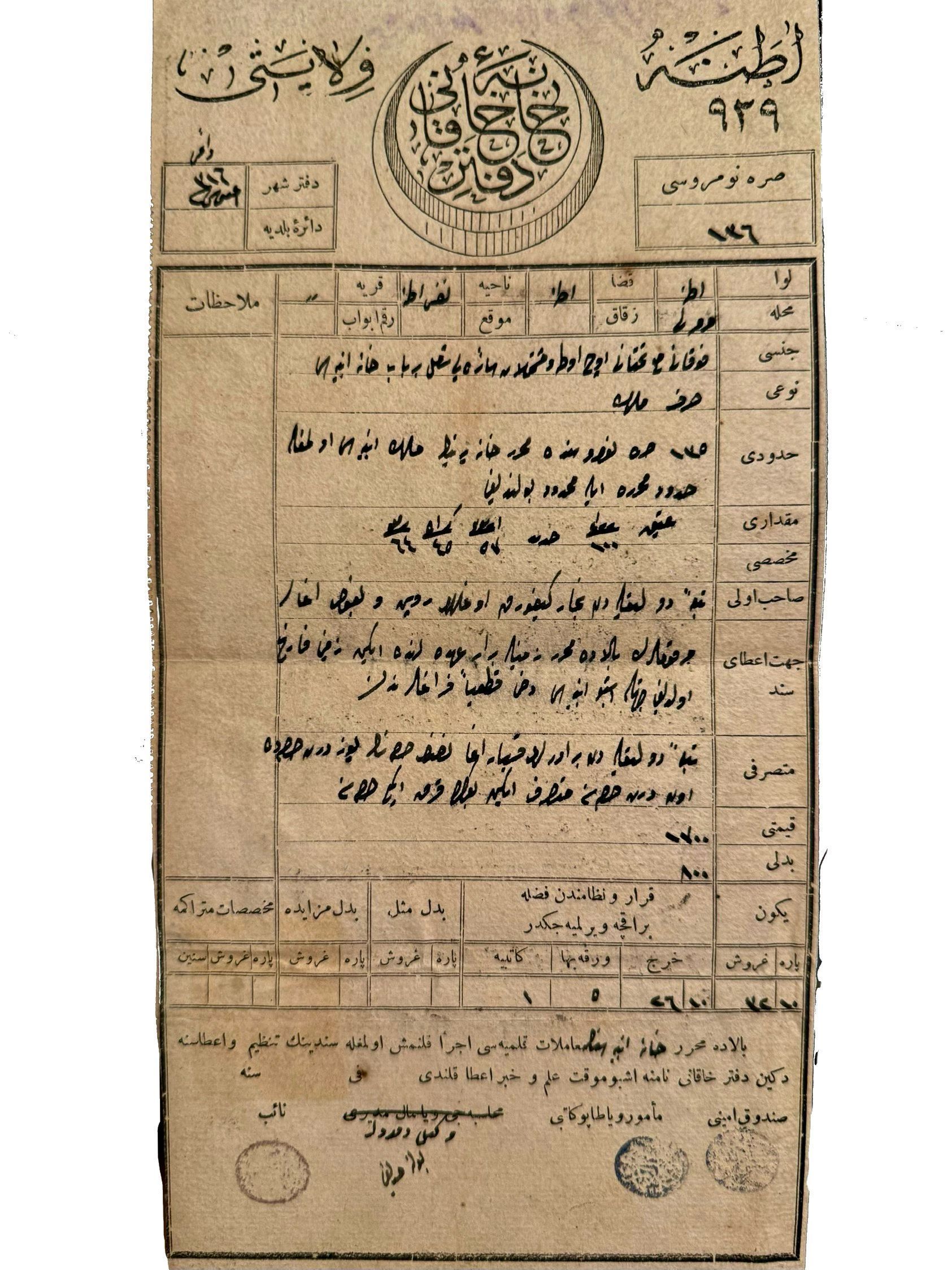 The measurements are 100 zira-i atik, 57 arşun-u cedid, 45 kirah, and 64 parmak. The original owners were Ruben and Boghos Agha, sons of Kevork (Kevorkian?), both of whom had passed away by the time of this record. Their brother, Kasbar Ağa inherited a significant portion of the estate. Initially, he owned 14 shares out of 104, but following his brothers’ deaths, his share increased to 42 out of 104. It was valued at 1,300 kuruş.Created By
