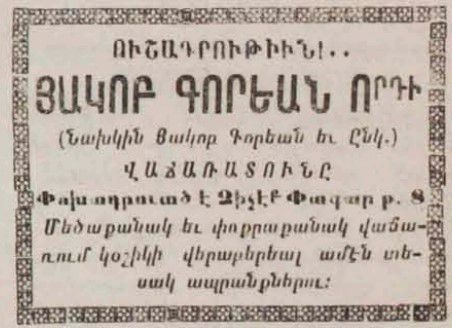 Based on a newspaper advertisement from 1922, Hagop Korian had passed his business to his son, who continued the enterprise at Çiçek Pasajı No. 8. The advertisement indicates that the company specialized in the selling of shoes.Dimensions