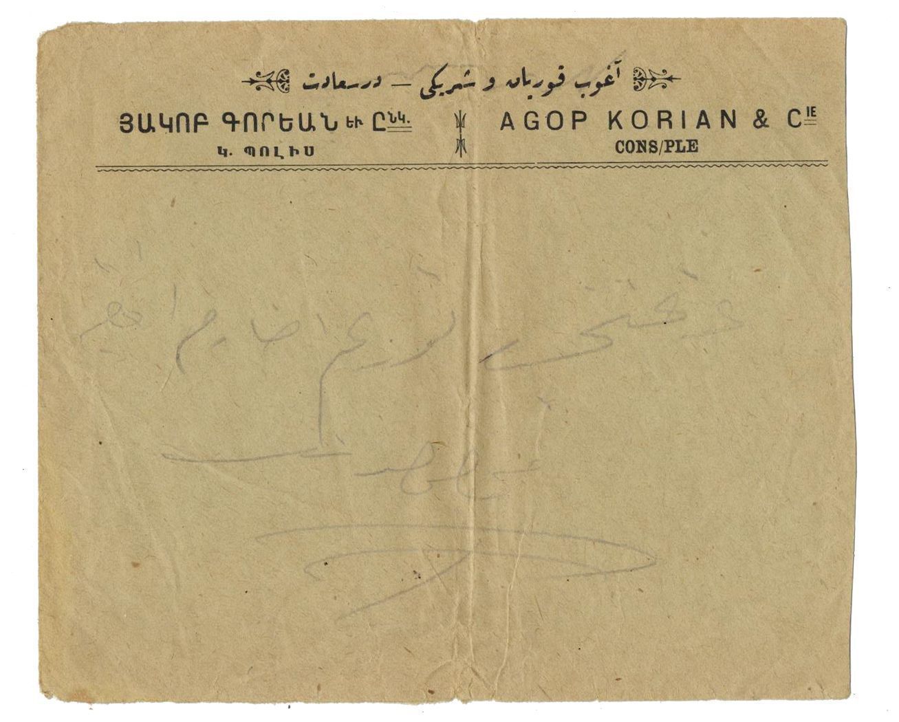 An envelope with the letterhead "Agop Korian ve Şerikî Dersaadet (Constantinople)", printed in Ottoman Turkish, French, and Armenian. The company operated in Istanbul’s Marpuççular Bazaar during the early 1900s.