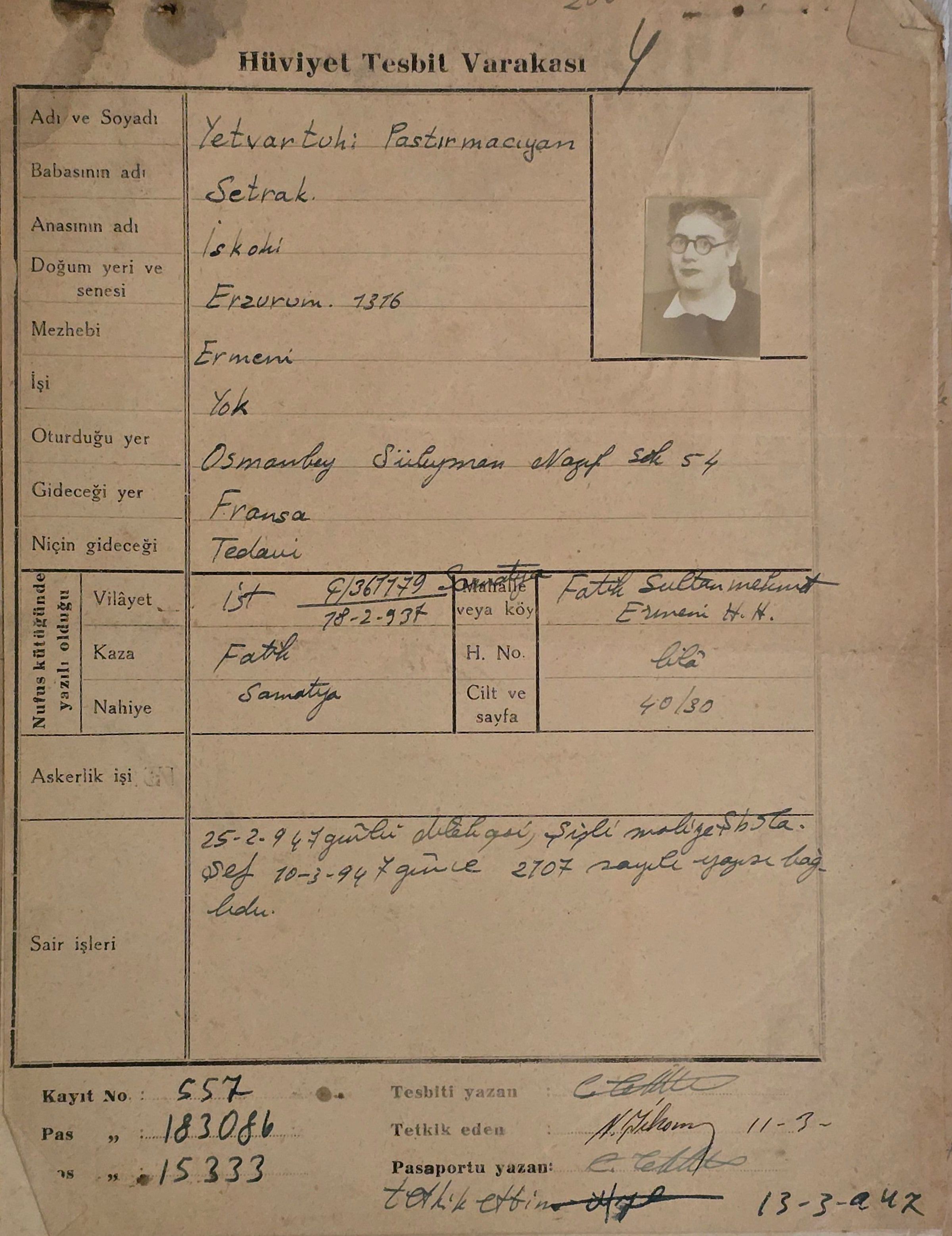 Yetvartuhi Pastırmacıyan was the daughter of Setrak Pastırmacıyan and the first cousin of Karekin Pastırmacıyan, also known as Armen Garo. Setrak was the son of Khachatur (Kaçatur) and Zanazan Pastırmacıyan, who had several children: Harutyun, Hovhannes (Ohannes), Dikran, Setrak, and their sisters.
