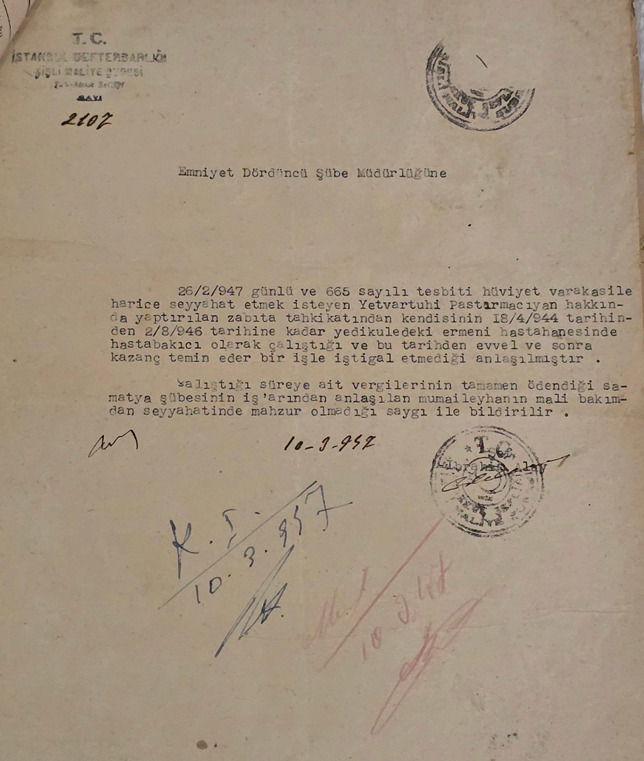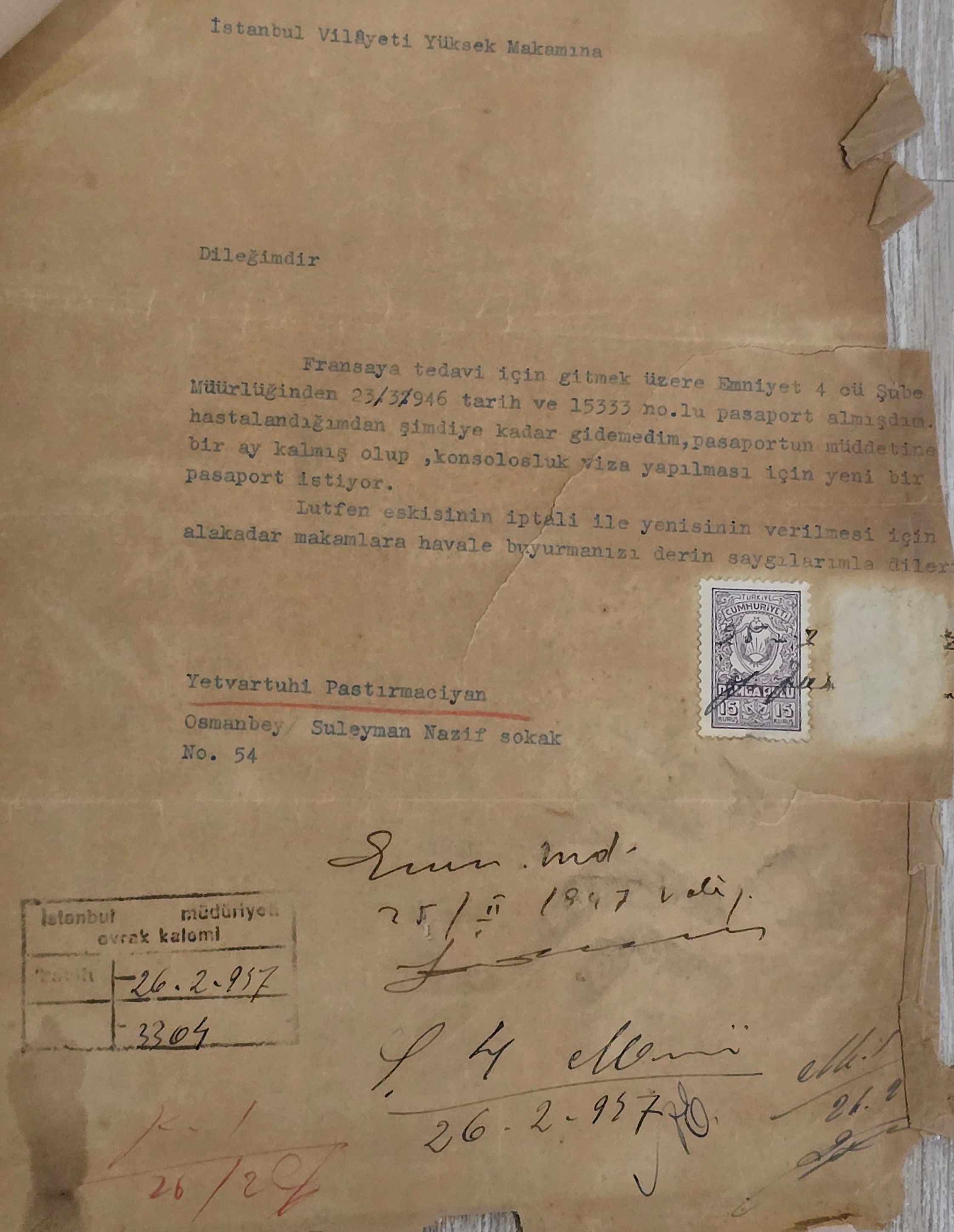 In 1908 Setrak Pastırmacıyan served as the assistant manager of the Erzurum branch of the Ottoman Bank. Before this, he—along with his brothers Hovhannes and Dikran—was sentenced to a long prison term for revolutionary activities. On February 10, 1915, just before the Armenian Genocide, Setrak was assassinated in broad daylight by two soldiers.