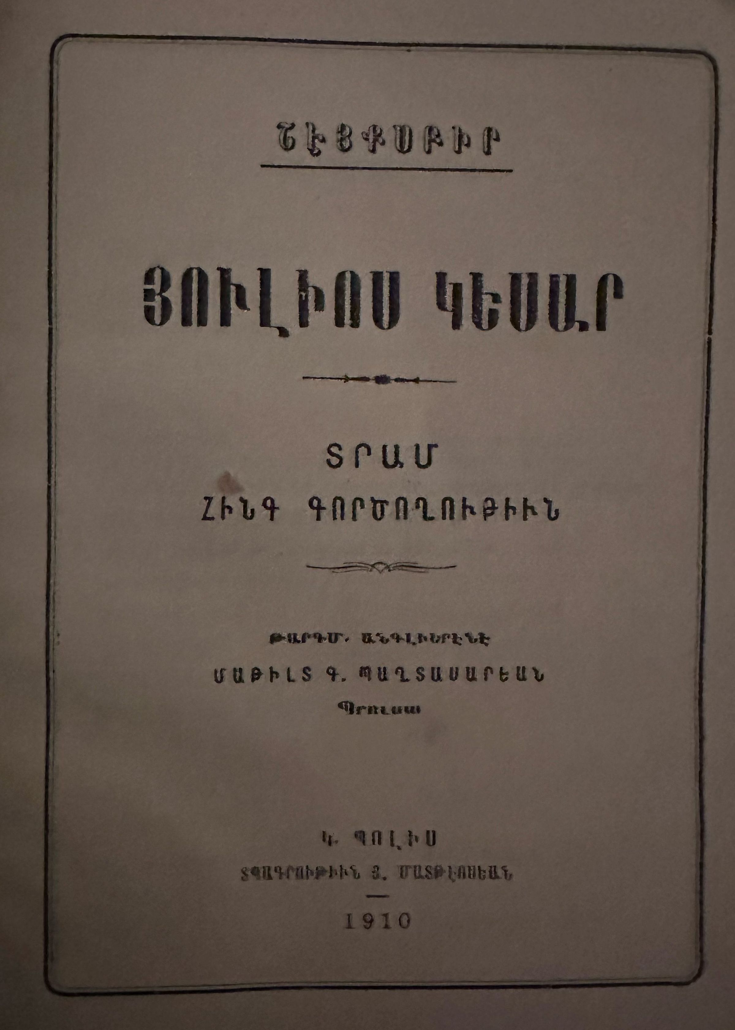 In 1910, Richard III was performed on the Armenian stage for the first time, with Amo Kharazian in the lead role. This was followed by Romeo and Juliet, featuring Arshavir Shahkhatuni and Satenik Adamyan in the main roles. In was around this time that Julius Ceasar was published with the translation done by Matilde K. Baghdasarian from Bursa.Book Details