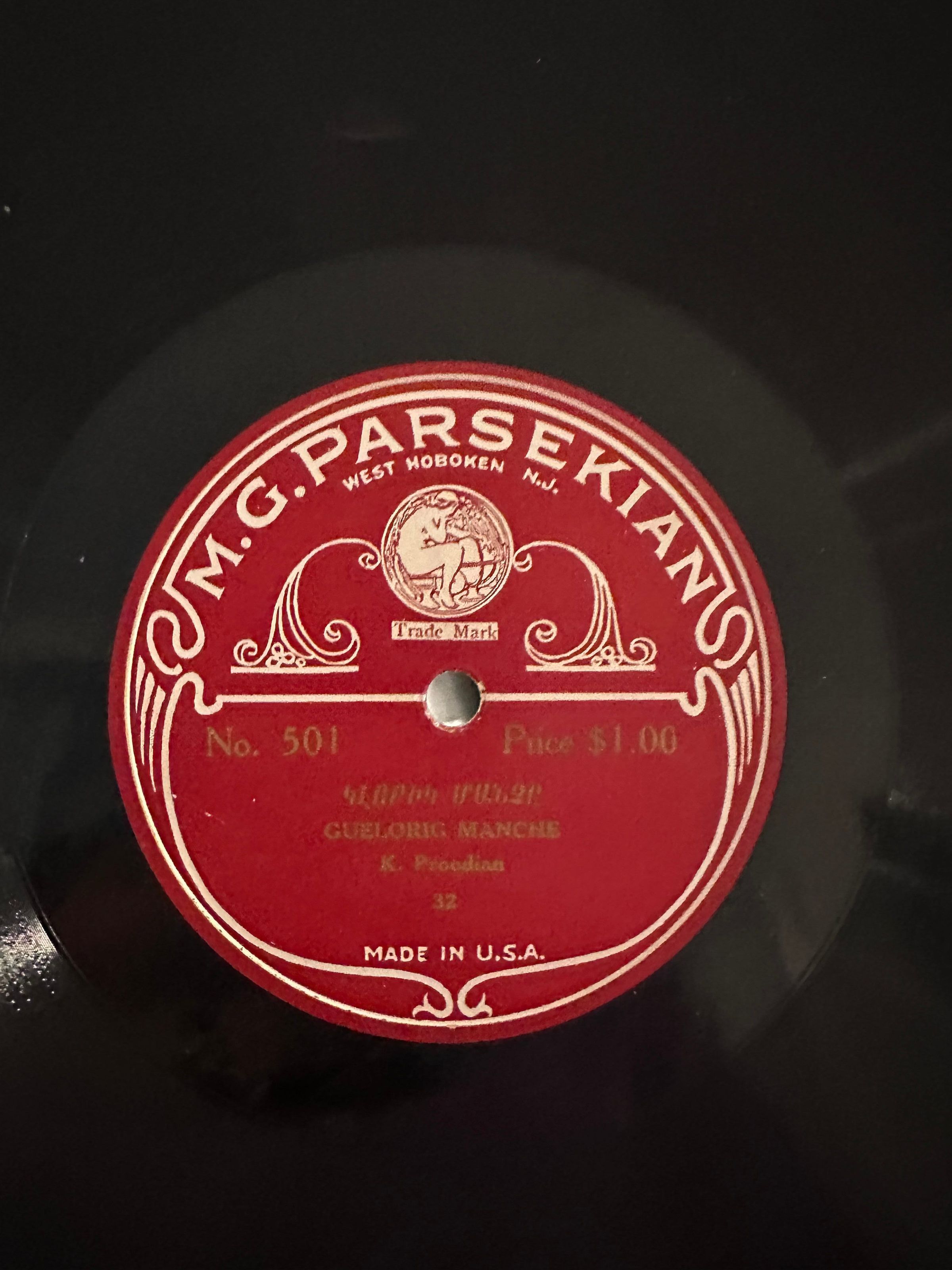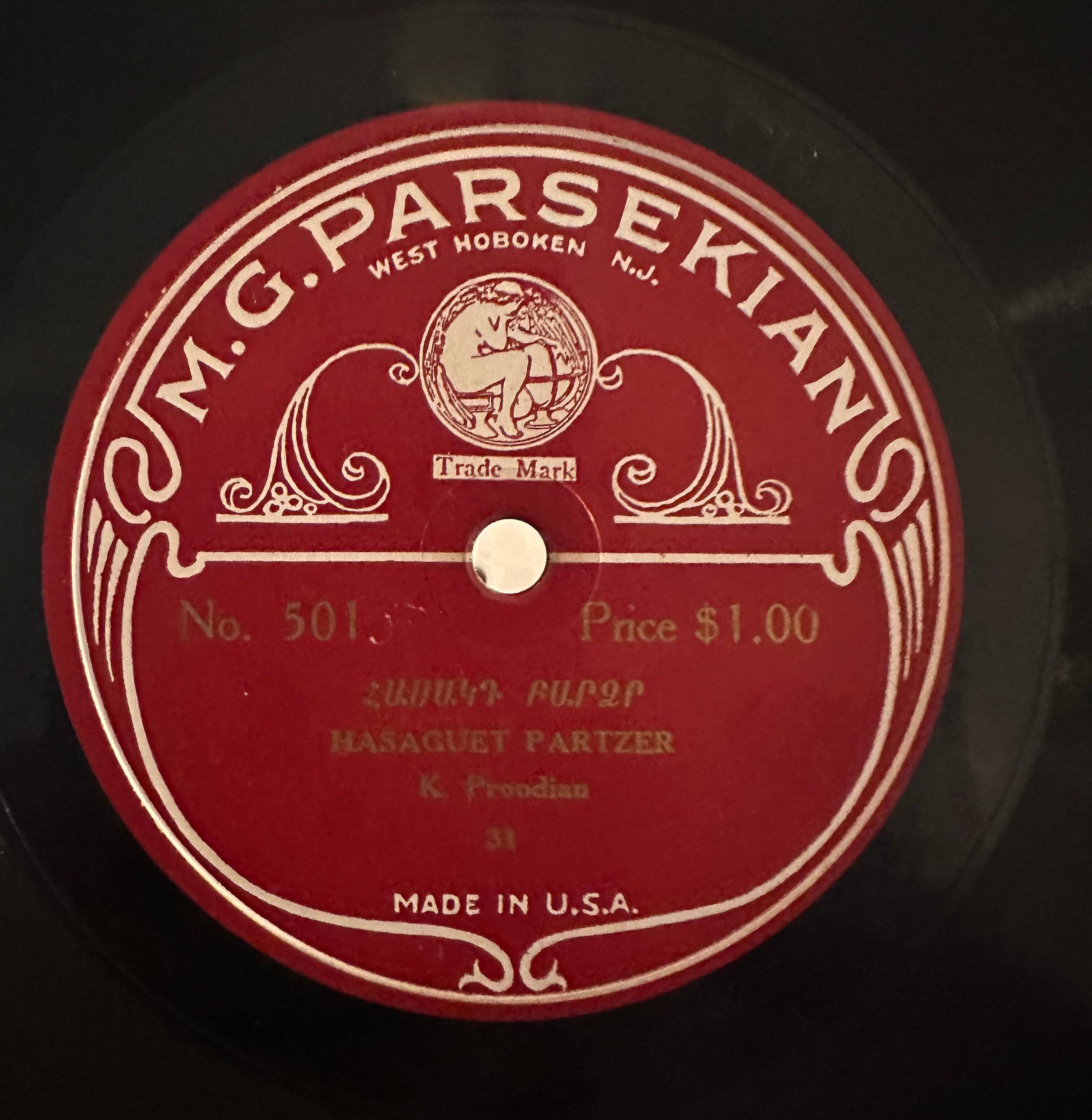 Karekin Proodian, born around 1884 in Diyarbakir, became the flagship artist for Parsekian’s label, recording nearly half of its catalog. After immigrating to the U.S. in 1903, he settled in West Hoboken, NJ, a community of fellow Dikranagerd natives, including Parsekian. Initially a photoengraver, he became a U.S. citizen in 1910, married Haiganoush Akmakjian, and returned to the U.S. with their son in 1912. The couple later had two more children, including Setrag, a future musician.