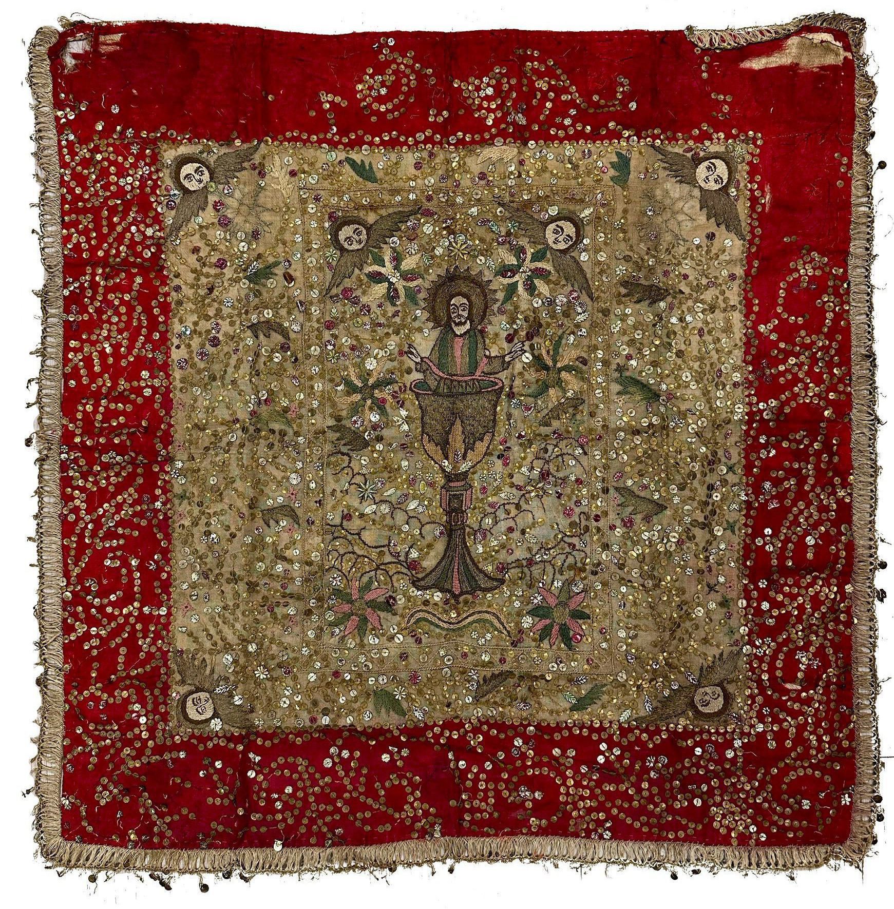 The depiction of Christ rising out of a chalice is characteristically Armenian. This piece seems to feature a fine felted wool background adorned with sequins, suggesting it dates to the second half of the 19th century. An expert, namely Sofi Khachmanyan, believes it originated in Constantinople.Created By