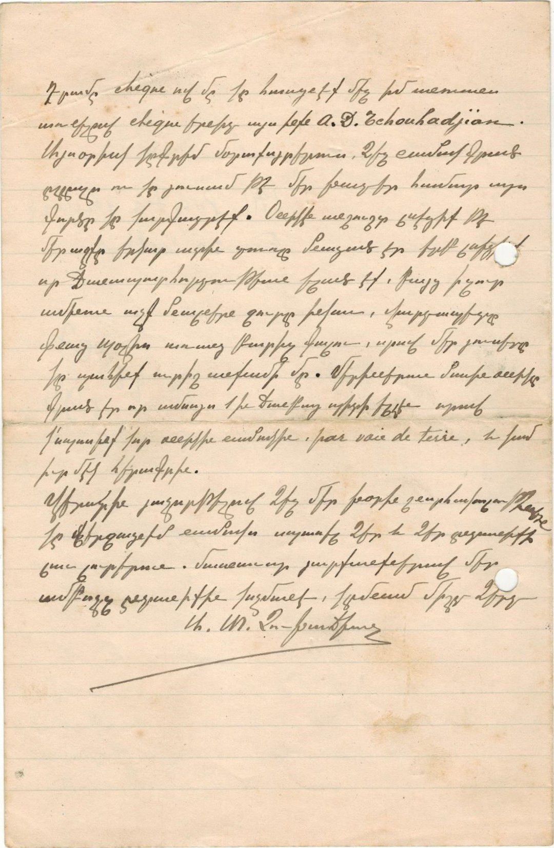 You will send the money to us with a cheque made out in my name, that is, A. D. Tchouhadjian. Today, I will write to my aunts to inform them that I have sent this letter to you, and I hope you will arrange this matter for our goodwill.