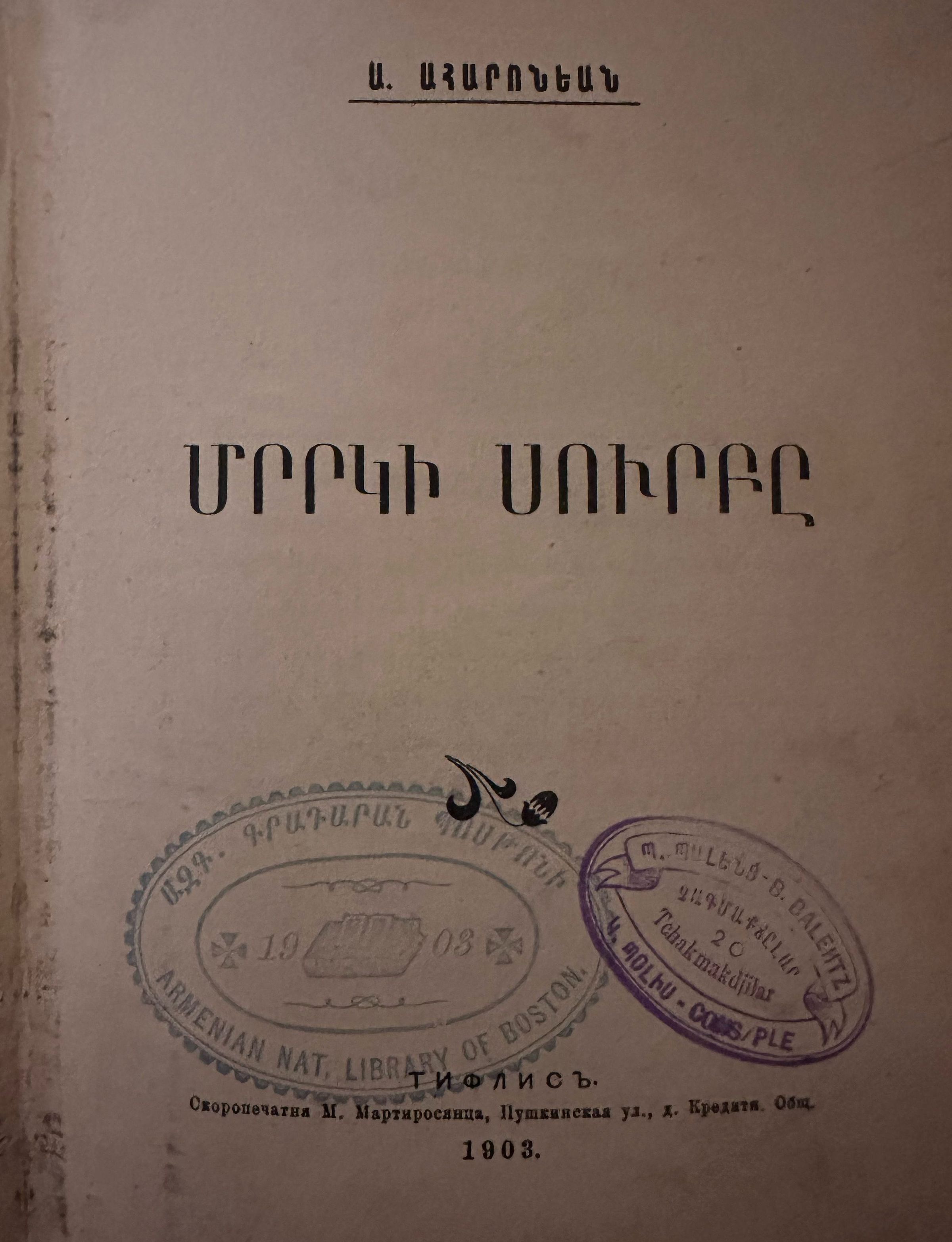 Leo wrote of the 'Saint of the Storm' as one of the best Armenian novels ever created 'from the perspective of an independent personality,' emphasizing that 'as a work of art, it has high merits; here the author is a master of the pen and has provided such descriptive gems that will adorn our modern, generally pale and colorless literature.'Inscription/Signature/Marks