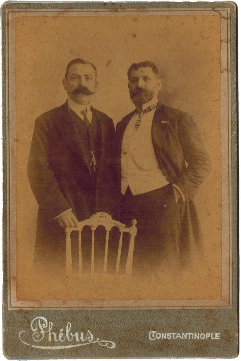 Photograph of an unknown person and Nazaret Daghavarian (1862–1915) who was was an Armenian physician, scientist, and political leader, best known as a founding member of the AGBU. Born in Sivrihisar, Sivas, he studied medicine in Constantinople and France before returning to practice as a physician and educator, contributing to medical modernization and public health in Armenian communities. Beyond his scientific work, Daghavarian was a key figure in Armenian political activism and was arrested by the Turkish authorities, he was released after mediation by the French embassy and in 1905 he moved to Cairo, where he worked as a doctor and teacher and participated in the foundation of the AGBU charity organization. In 1908 after the Young Turk revolution he returned to Constantinople and was elected as a member of the Ottoman parliament and Armenian National Central Committee. This photograph was taken upon his return to Constantinople. His leadership and writings helped strengthen Armenian national consciousness, emphasizing the importance of education and self-determination. In 1915, during the Armenian Genocide, he was among the intellectuals arrested in Constantinople on April 24 and later executed by Ottoman authorities.