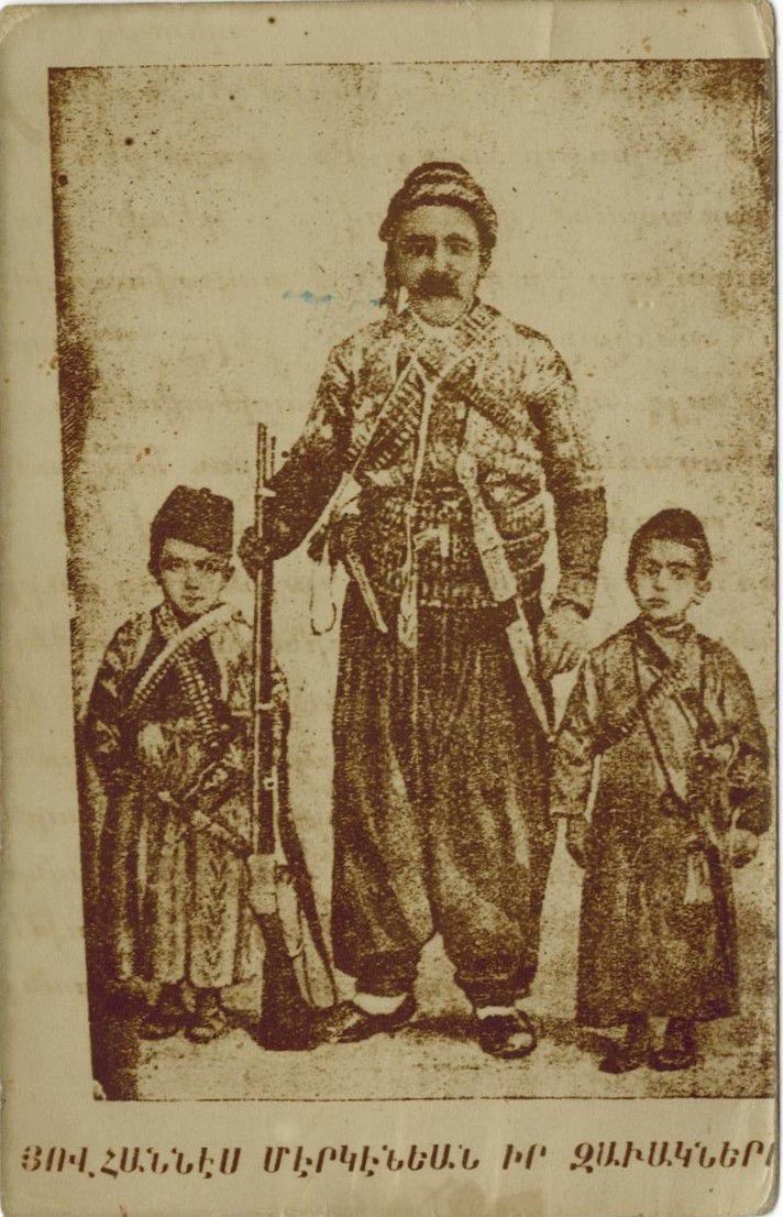 Postcard of Hovhannes Mergenian and his two children. Hovhannes played an intrumental role in the 1895 self-defense of Zeytun. A note on the back of the postcard reads "Zeytun's Heroes"Created By