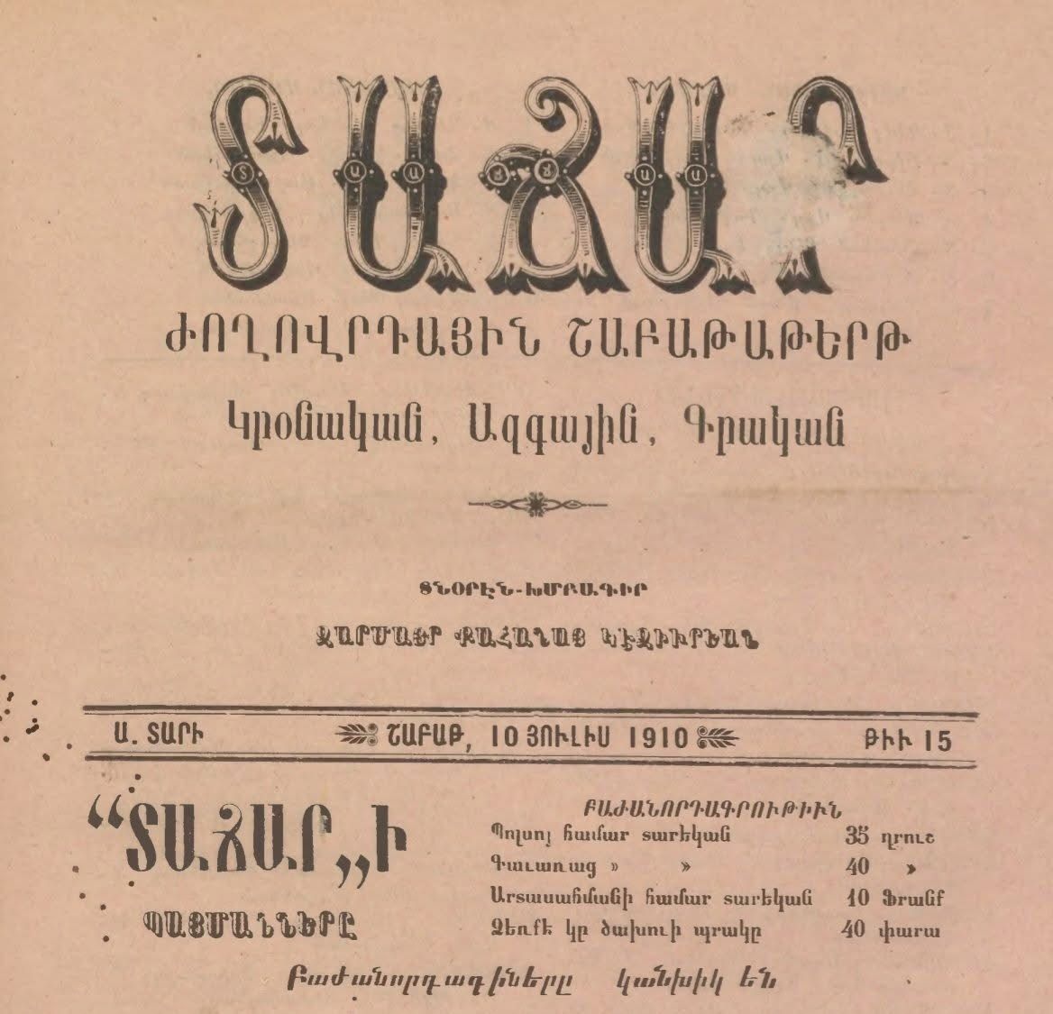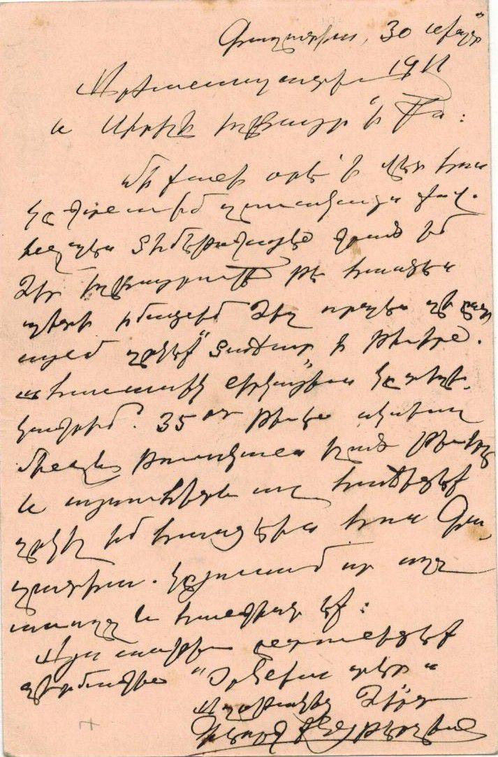 մի քանի օրէ ի վէր հոս կը գտնուիմ զաւակատ(?)ս քով: ինչպէս տիմէթոգոյէն(?) գրած եմ Ձեր եղբայրովք թէ հասցես պիտի իմացնեմ Ձեզ որպէս զի ըստ այնմ ղրկէք Տաճարի թիւերն: Ահաւասիկ ներկայիս կը տեղեկագրեմ 35րդ թիւէս սկսեալ մինչեւ թուականս եղած թիւերը եւ այսուհետեւ ալ հաճեցէք ղրկել իմ հասցէիս հոս Գաղատիա: