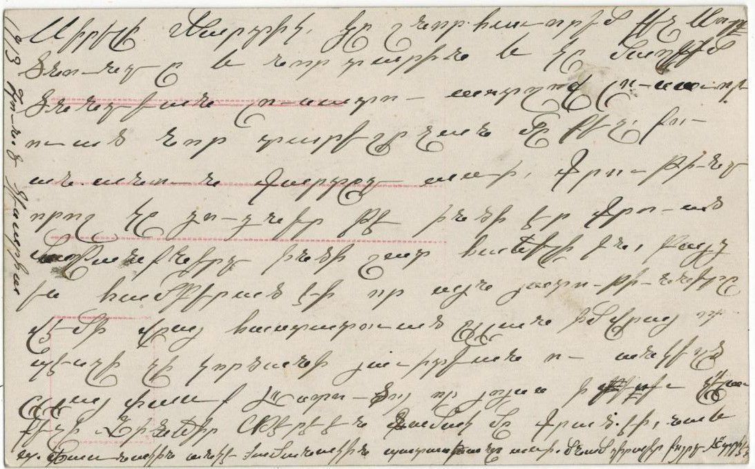 Dear Mardig, I congratulate you on the occasion of Christmas and New Year and I wish you a new shiny year. I received your unnamed (Christmas) card. The writing indicated that it was addressed to me. Your wishes are very pleasing for me. But I had patience that these qualities would be established on a rock in order to remain undestroyed forever and be sincere. Thank God my expectations did not go in vain. I had sent you a letter from Zinjir Dere and also to Mr. Parnag. I received the response from him. I remain yours with love, your sister (Adrine?).Postcard Details
