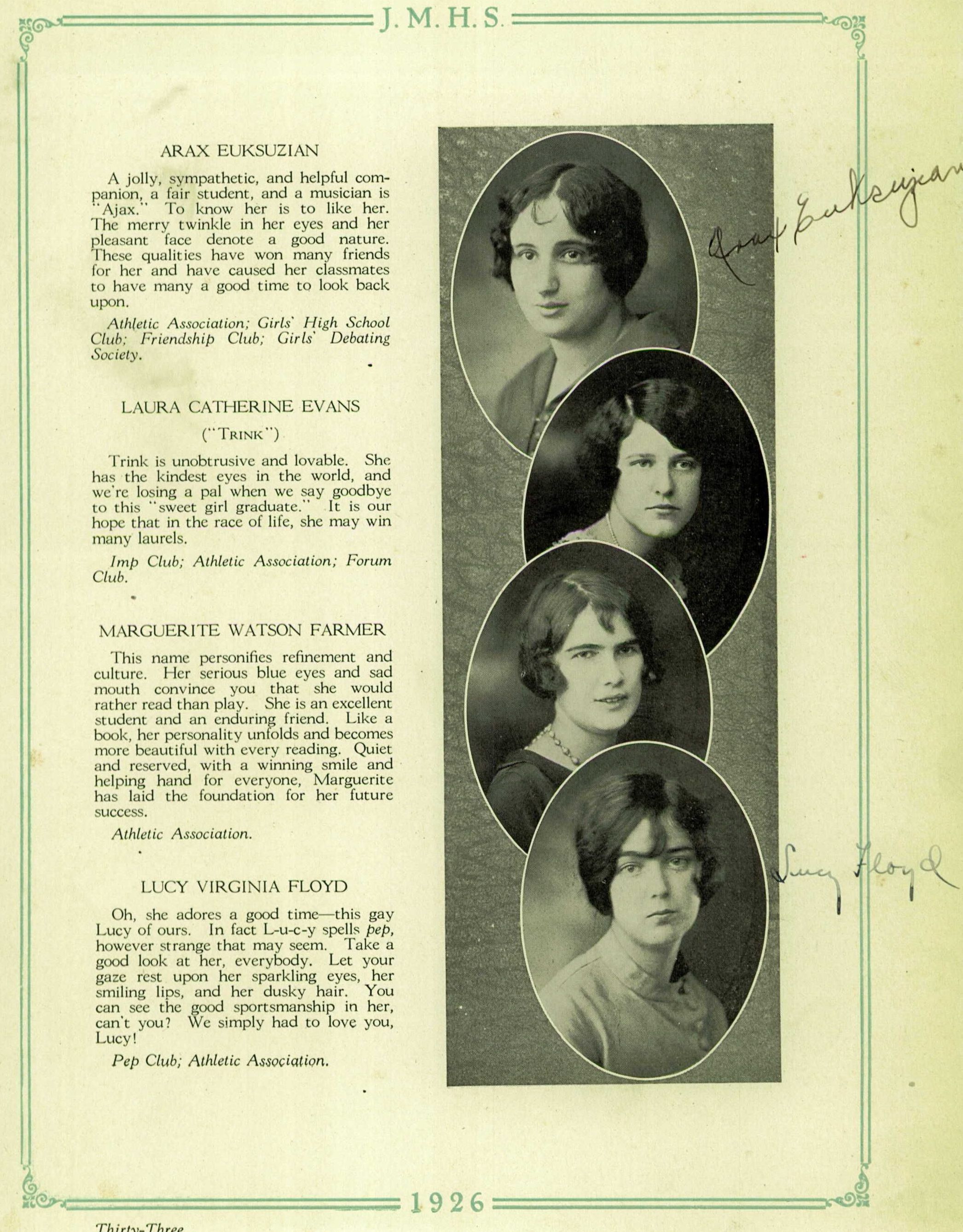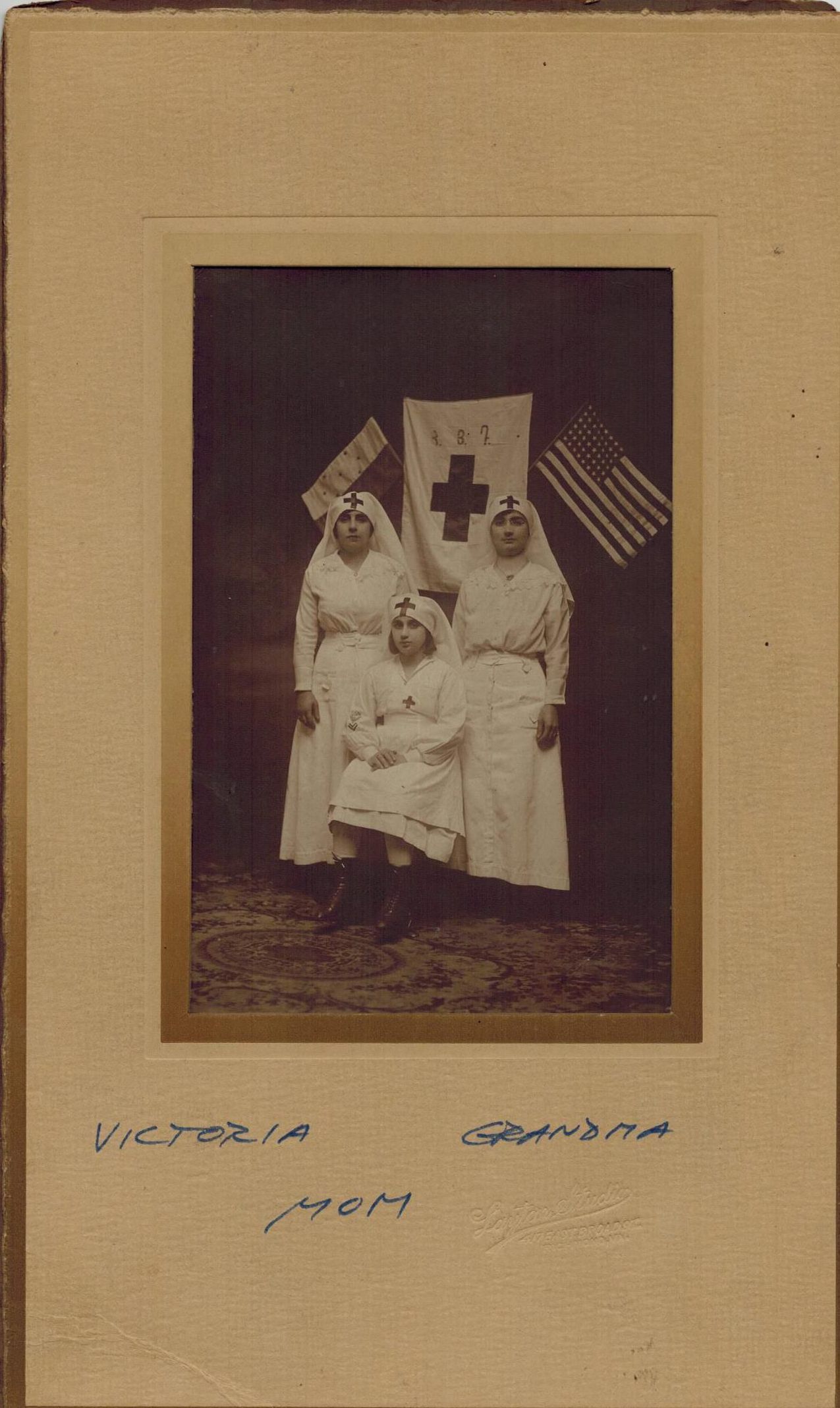 Victoria Euksuzian (left), sister of Simon Euksuzian (Photograph #9), was born in Ünye and immigrated to the United States in 1911. She married Neshan Garabad Shamigian who was from Palu. On the right is Nazenik (Bostanjian) Euksuzian, wife of Simon, who arrived in the U.S. in 1904. Seated in the center is their daughter, Arax, who was born on June 11, 1909, in Richmond, VA. The flag behind them represents the ՀՅԴ (Armenian Revolutionary Federation), and the three women are dressed in Red Cross uniforms, signifying their role in providing aid to Armenians, possibly as members of the Armenian Relief Society.Photograph Details