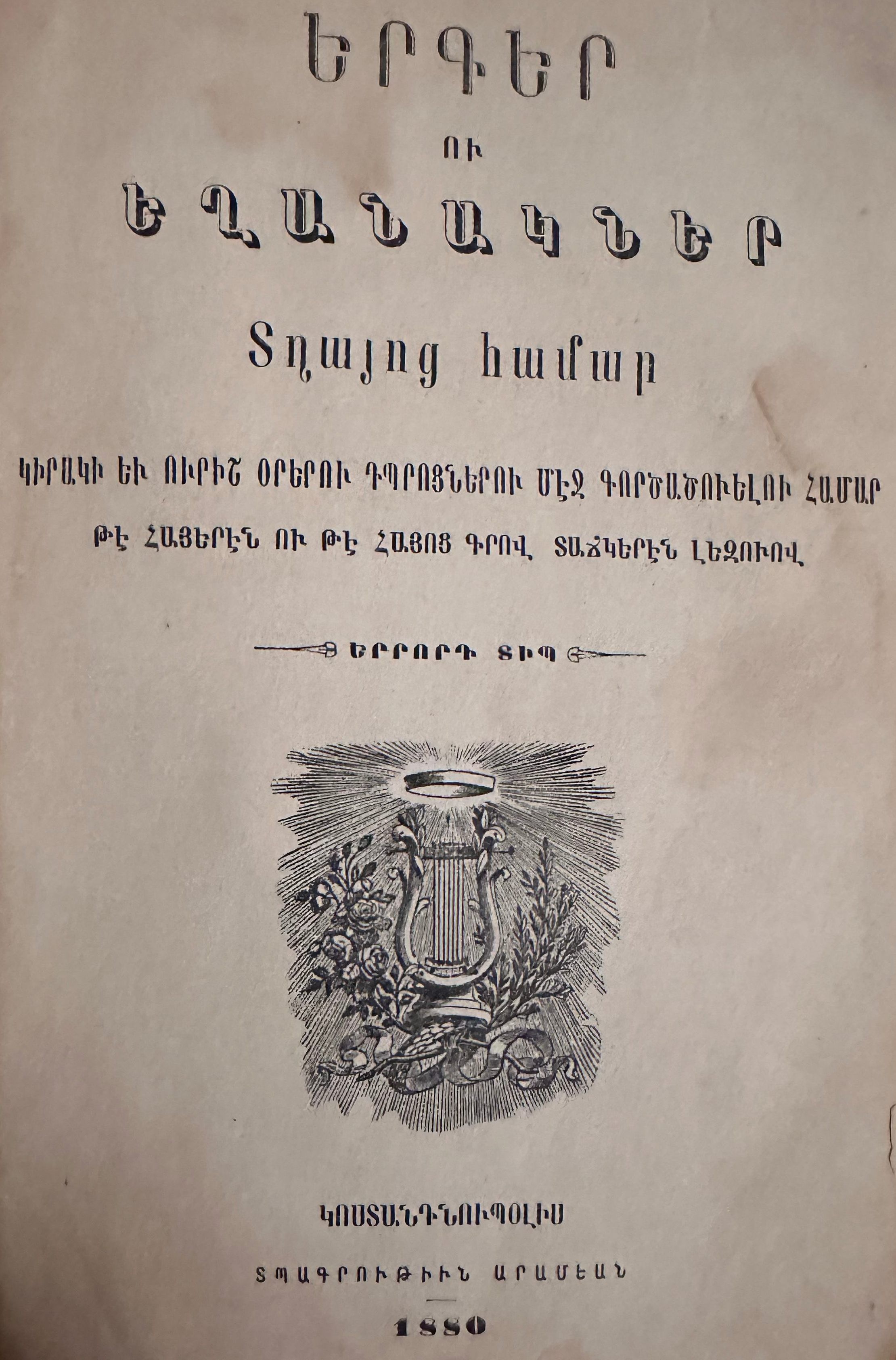 A book that has a collection of song that can be sung in schools on Sundays and other days, both in Armenian and in Turkish with the Armenian alphabet. This book was first published in 1868. Subsequent editions are from 1880 and 1884.Category