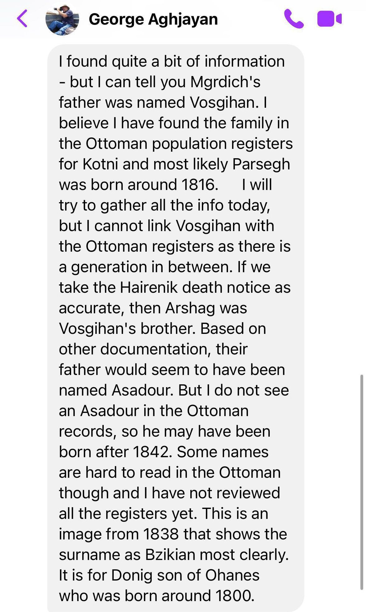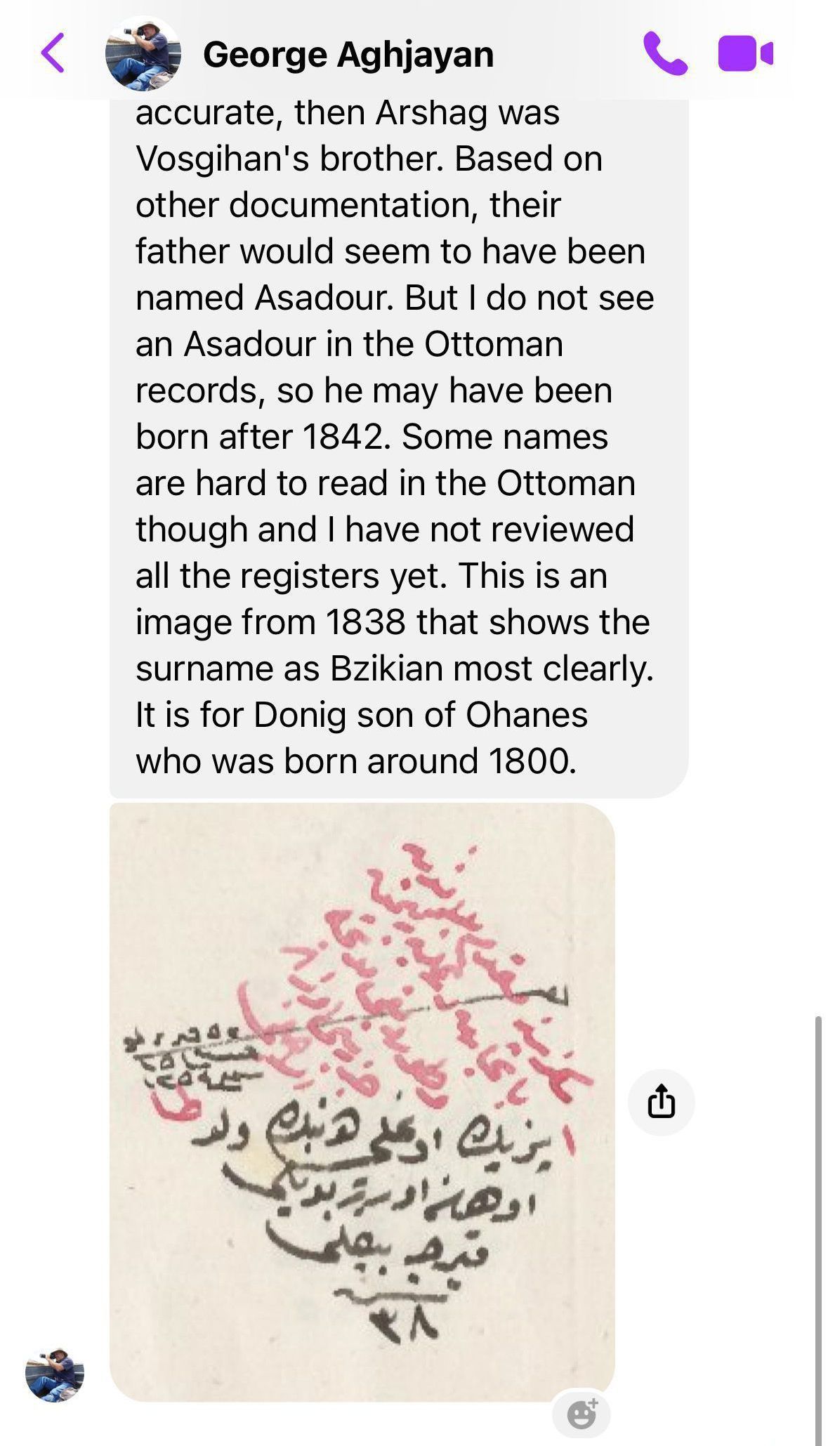 The inscription on the bowl reads ՔՕԹՆԵՑԻ ՊԵԶԻԿԵԱՆ ԲԱՐՍԵՂ 1876, translated as "Kotnetsi Bezigian Parsegh 1876." Kotni refers to a small village near Hafik, now known as Alçiören. I have traced the family lineage through an obituary for Mkrtich Bezigian, who emigrated to the United States, though the exact connection between Mkrtich and Parsegh remains unclear. According to George Aghjayan, Parsegh is believed to have been born in 1816. The bowl is rare due to its use of a geographic identifier (Kotnetsi), a detail that seems to have been retained by Armenians from Kotni even after emigrating to the U.S., signifying a strong sense of pride in their village. The tin coating suggests the bowl was intended for eating.Category