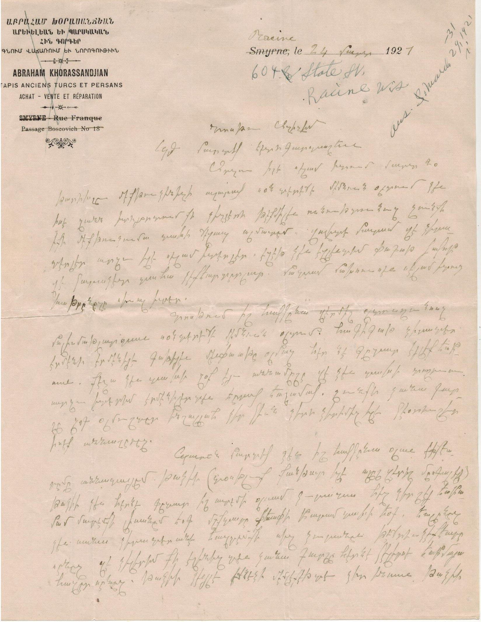 Apraham Khorassandjian was born in Gesaria (Kayseri) in 16 March 1884 (Mark Aslan erroneously lists his birthplace as Sivas). His Smyrna address, listed on his letterhead as Passage Boskovich No. 18 off the prestigious Rue Franque, does not appear on the Goad map of 1905 or in the Annuaire Oriental of 1913. This suggests that Khorassandjian likely moved to Smyrna after the Armenian Genocide, continuing his involvement in the carpet trade—a profession he likely practiced in Gesaria.
