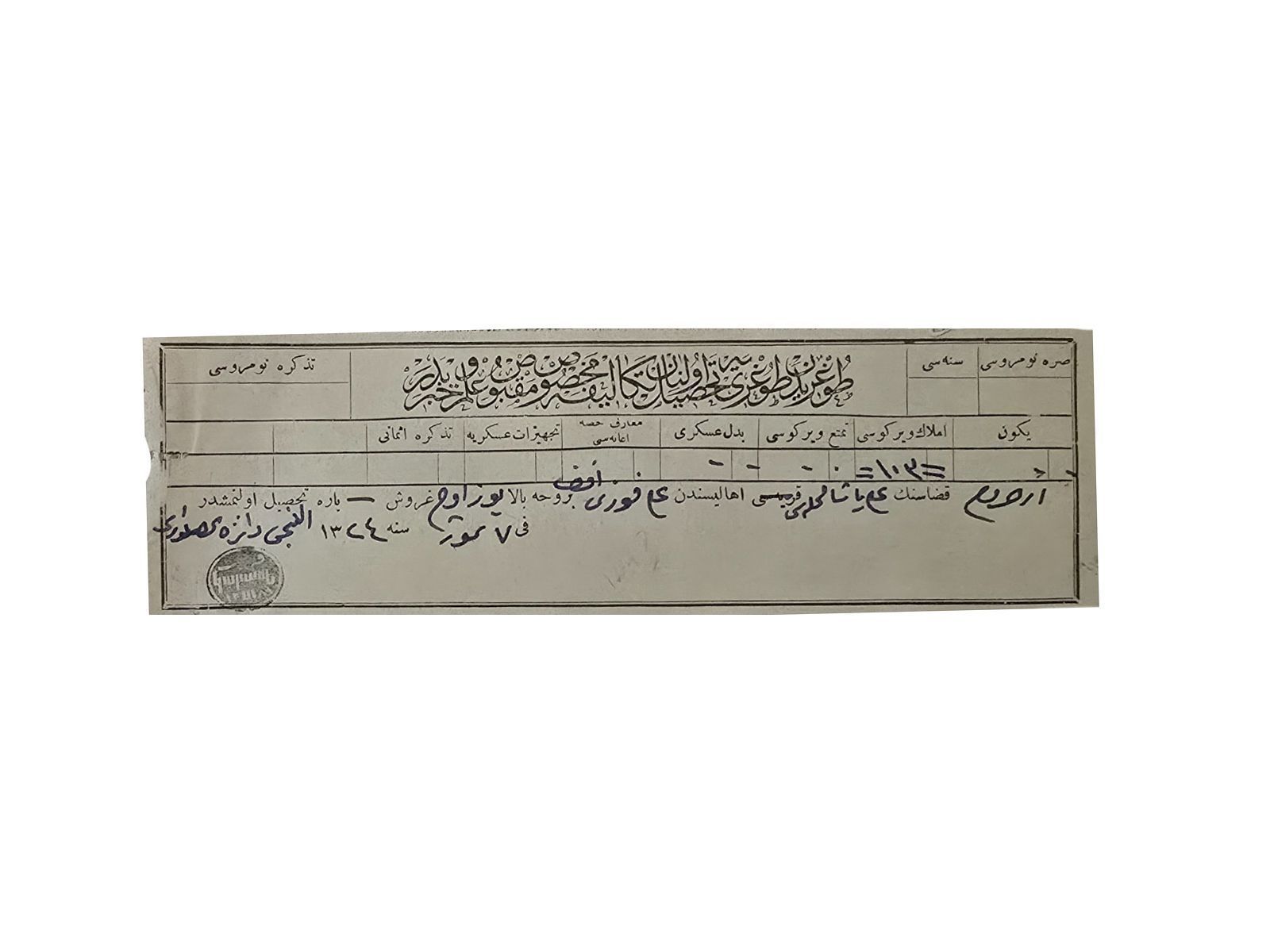 Property tax payment receipt that dates to the year 1324 in the Rumi calendar (1908 Gregorian). They pertain to the Ali Pasha neighborhood in Erzurum, with the taxpayer identified as Ali Fevzi Efendi. The documents bear a stamp in Armenian reading “Garabed” who was the tax collector of the “sixth district.”General Notes