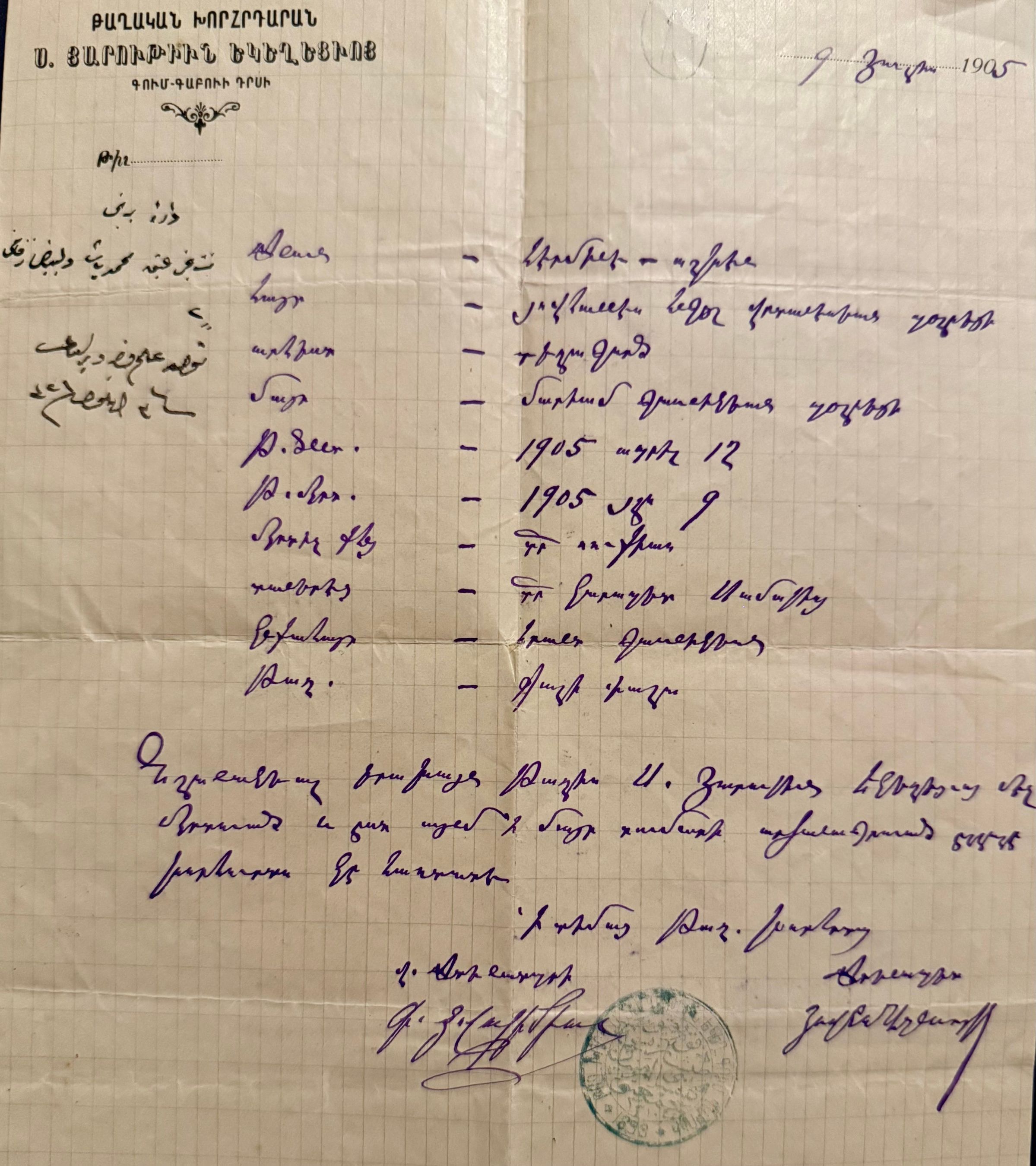 Ի դիմաց Թաղ. Խորհրդոյ / Վ. Ատենադպրի / Գ. Յովակիմեան / Ատենապետ/ Յովհան.... [ստորագրութեան վերջին մասը հասկանալի չէ, հաւանաբար Յովհաննէս Ազնաւուրեան]։Created By