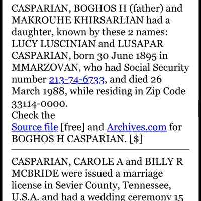 Vahanoush Kasparian married a John J Yorganjian. Gave birth to John James Yorganjian Jr. in 1935, who lived in Philly. Her husband died in 1974, and she died in 1977, buried in Lake Worth.Created By