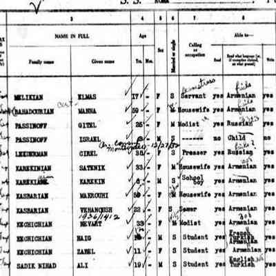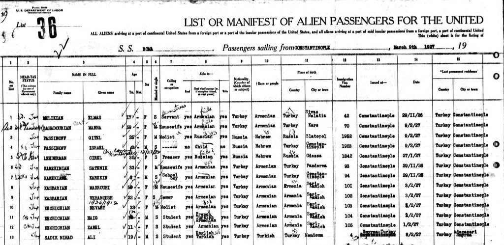 Several members of the family emigrated from Merzifon to the United States in the early twentieth century. In 1921, Lusaper emigrated and was able to retain the surname Kasparyan. She later married Leon Luscinian, became known as Lucy Luscinian, and settled in Baltimore, Maryland. The couple had four children. Lucy applied for U.S. citizenship in 1925 and passed away on 26 March 1988. Vahanoush, born in 1905, later emigrated to the United States with her mother Makrouhi (born 1877), who adopted the name Maria after their arrival. Makrouhi entered the country as a widow, indicating that Boghos had died—most likely as a result of the Armenian Genocide. They arrived in the United States on 30 March 1927. Nevart, also a widow, emigrated under the surname Kechichian. She arrived with her two children, a son, Haig, and a daughter, Zabel.