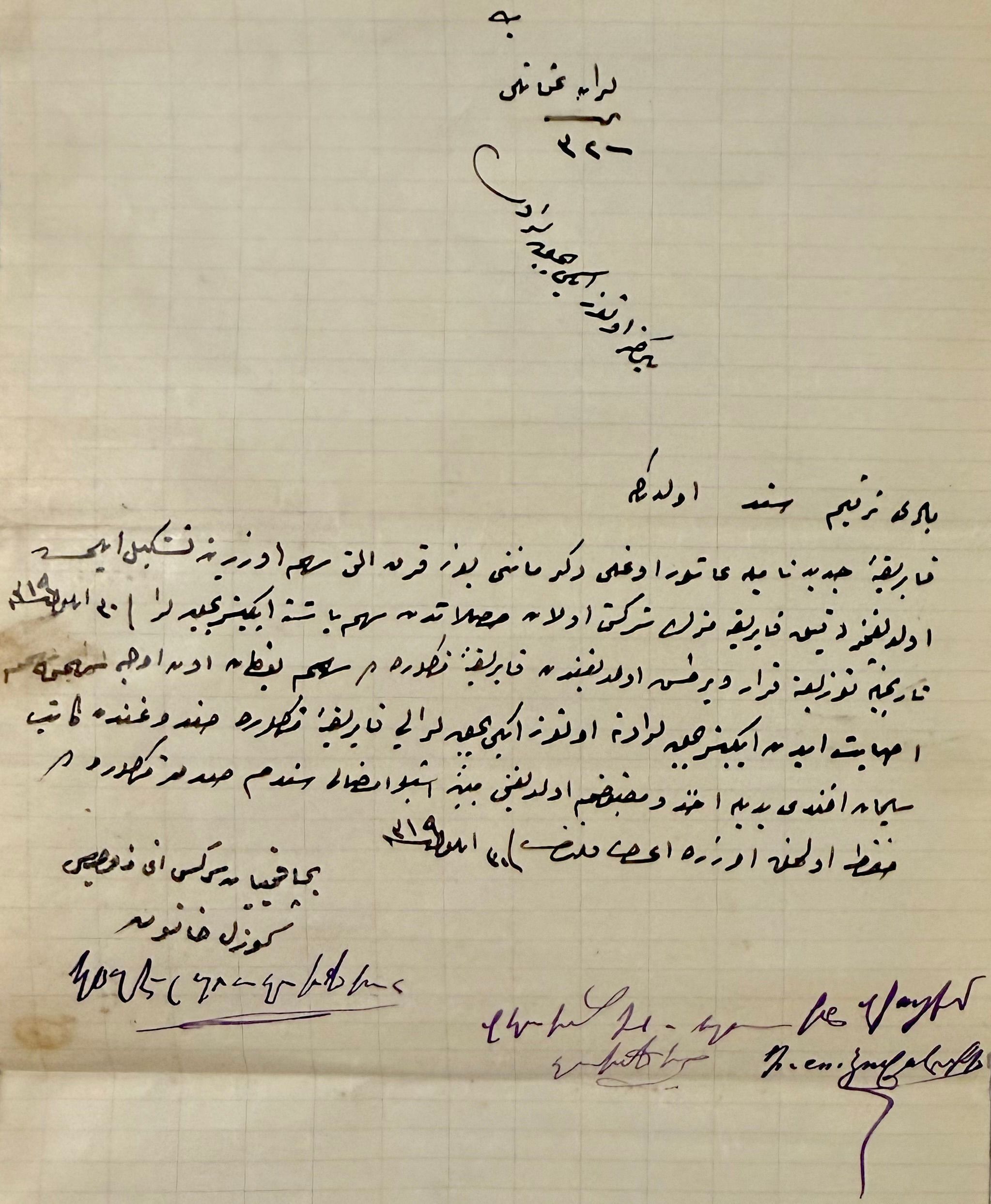 Since it was decided on 30 September of the year 319 that, from the profits of the company of our flour (un) factory—established under the name New Factory (Fabrika-yı Cedid) upon one hundred and forty-six shares of the Aşuroğlu Mill—an amount of two and a half liras per share would be distributed, I received, for the thirteen shares that belong to me in the said factory, the amount of two and a half liras per share.