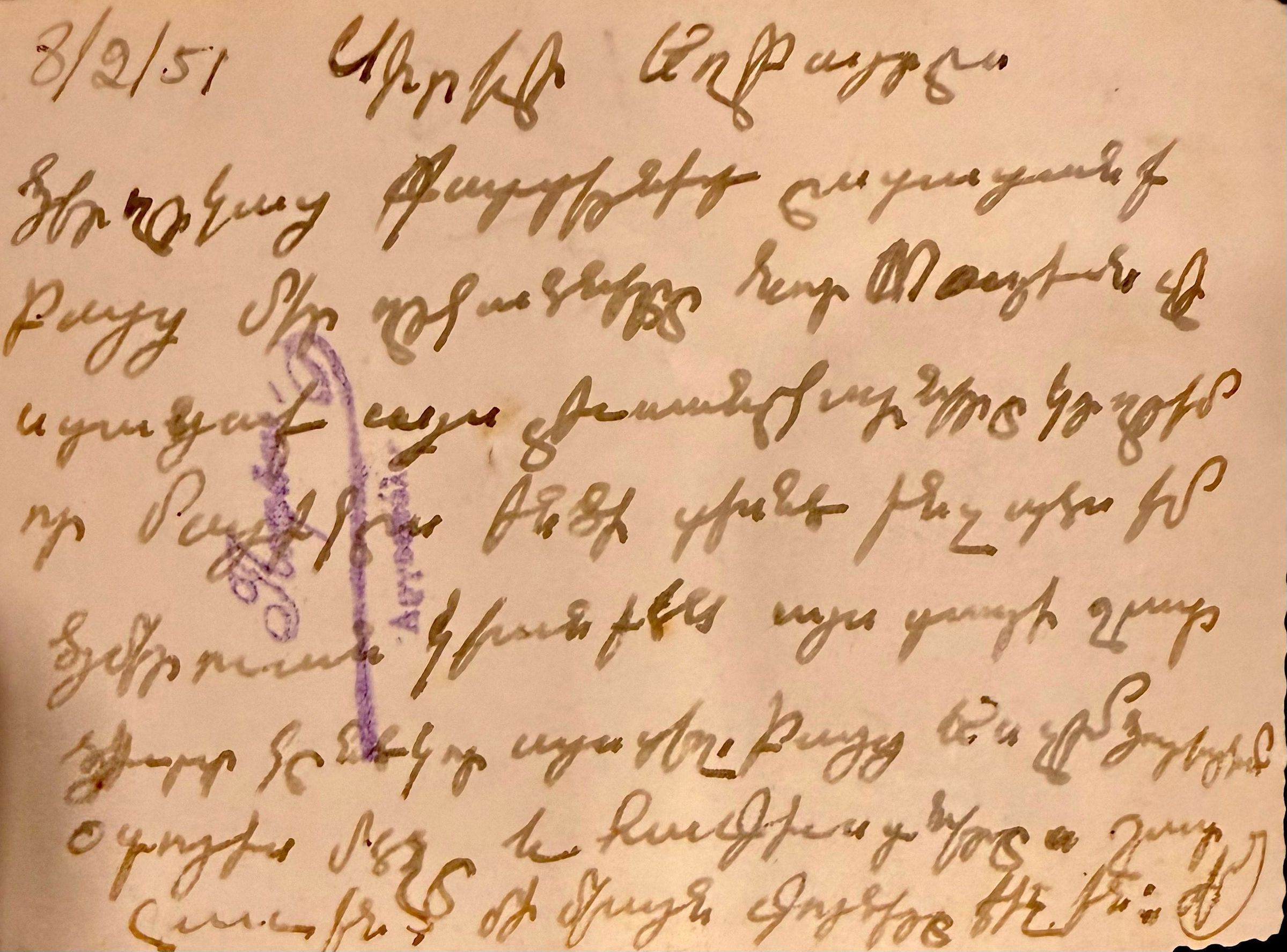 Ձեր ղրկած գարտերնիդ ստացանք բայց մեր ղրկածները նոր տարուան չի ստացաք այս լուսանկարները կը ղրկեմ որ մայրիկս ինծի տեսնէ ինչպէս եմ ձմերուան կեանքէս այս տարի շատ ցուրտ կնեկոր այստեղ. բայց ես չեմ ցուրտ? իմ?