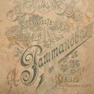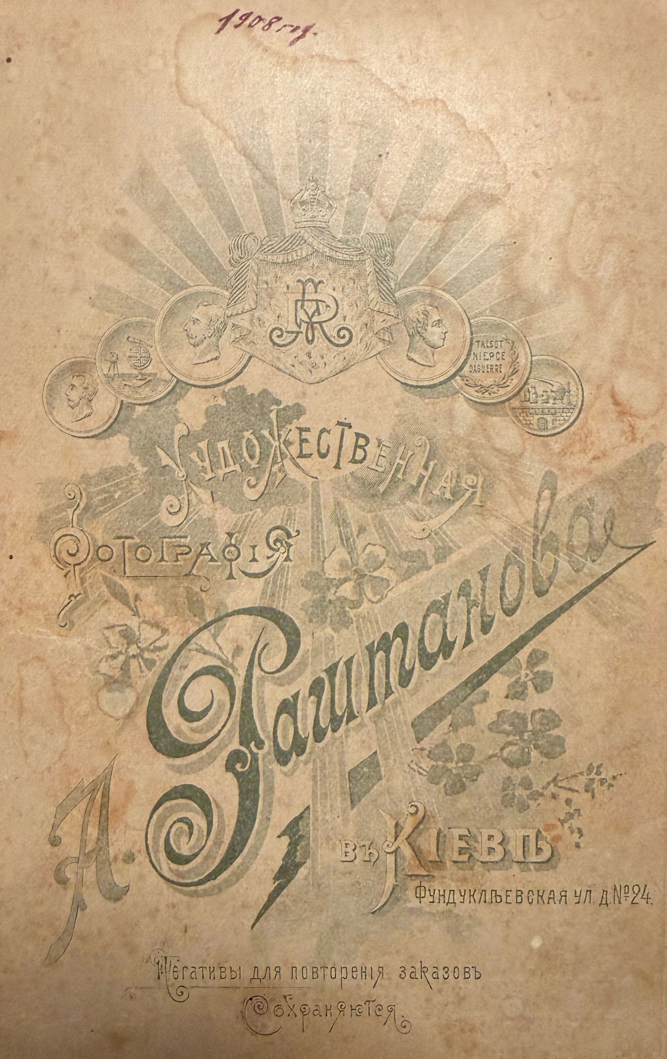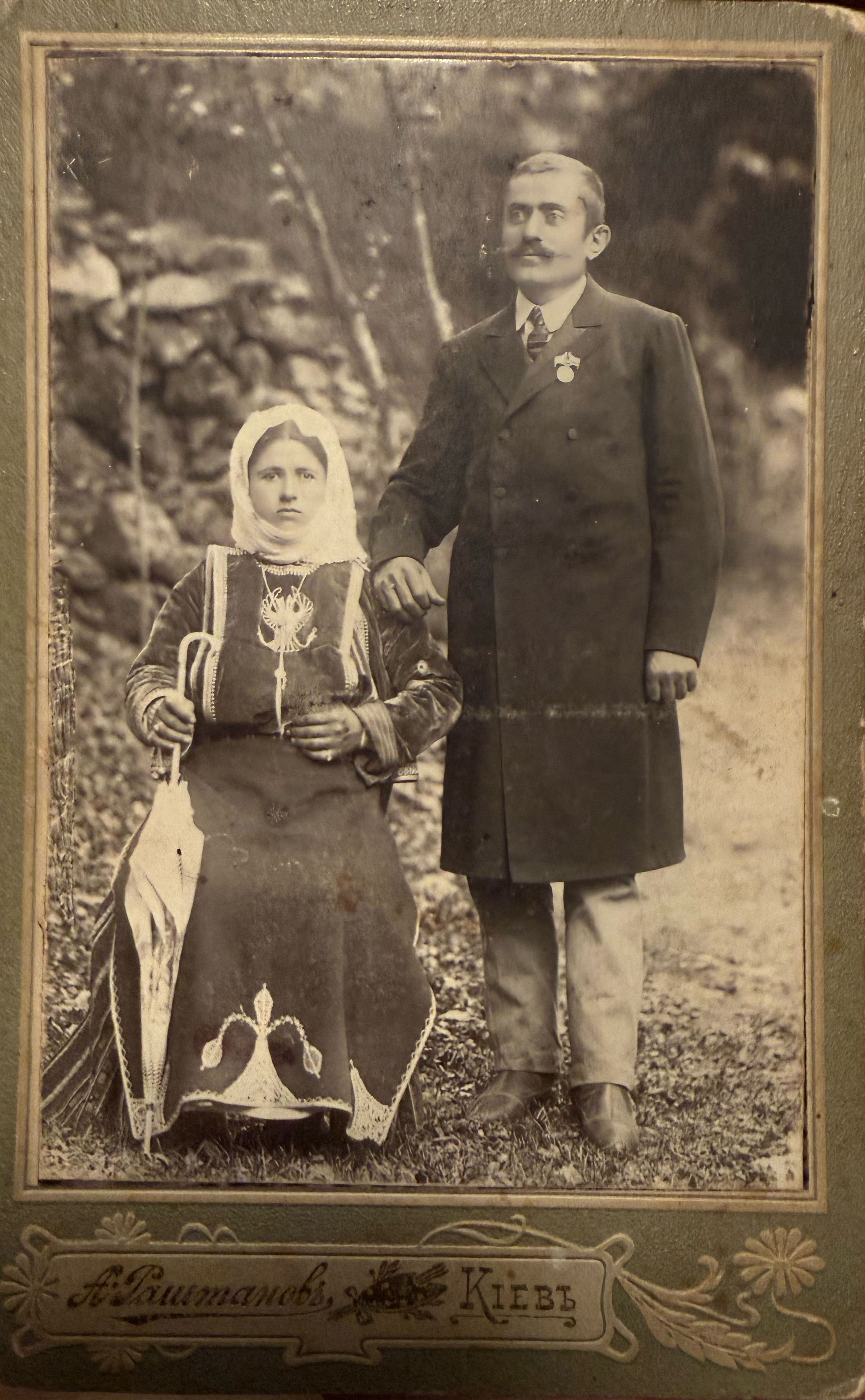 The year “1908” is written on the back of the photograph. The subject is likely Lusik Burkhachyan, who closely resembles the individual shown in Photo #26. The man pictured may be Lusik’s husband, Hovnan Demurchyan. The photograph is likely pasted on top of a cabinet card from Kiev.