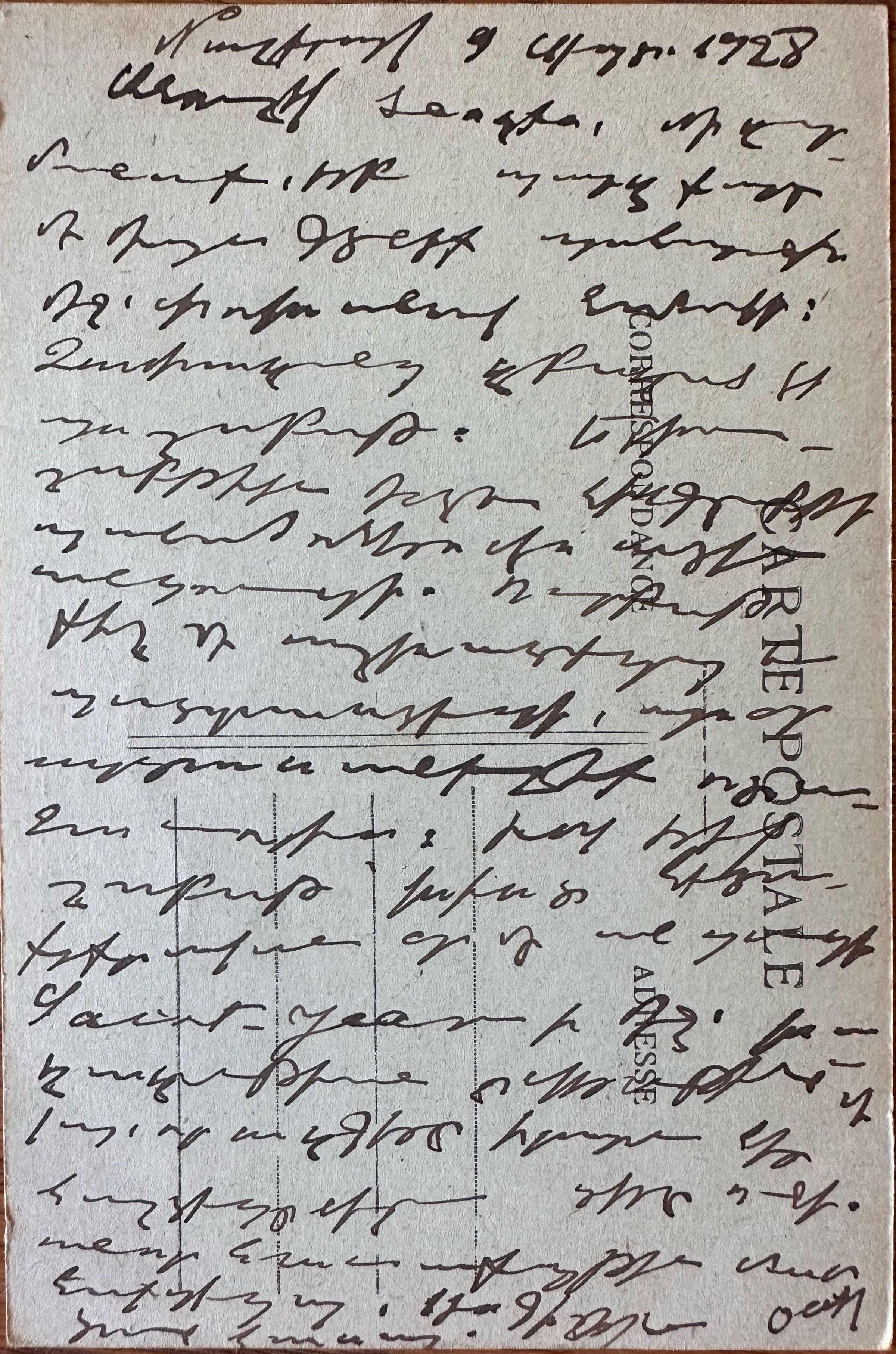 Անուշիկ ծնողքս։ Մի՛ զարմանաք, երբ պարզ քարտ մը միայն գտնէք պահարանի մէջ՝ փոխանակ նամակի։ Չափազանց զբաղած էի այս շաբաթ. երկուշաբթիէն մինչև հինգշաբթի պահածոներովս ատեն անցուցի. ուրբաթ քիչ մը աշխատեցայ և պատրաստեցի այսօր արտասանելիք ոտանաւորիս, իսկ երէկ շաբաթ՝ խիստ հետաքրքրական օր մը անցուցի Saint-Jean-ի մէջ. խաղաղութեան ընկերութիւն մը կայ, որ ազգերը իրարու հետ հաշտեցընելու դերը ունի․ անոր հաւաքոյթին մասնակցեցայ։ Ուշ գիշերն անց տուն հասայ։Relationships