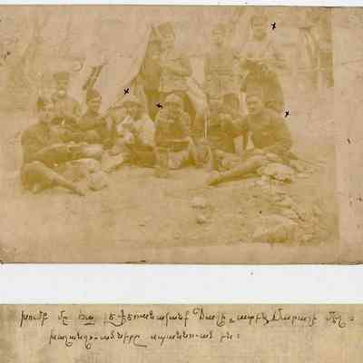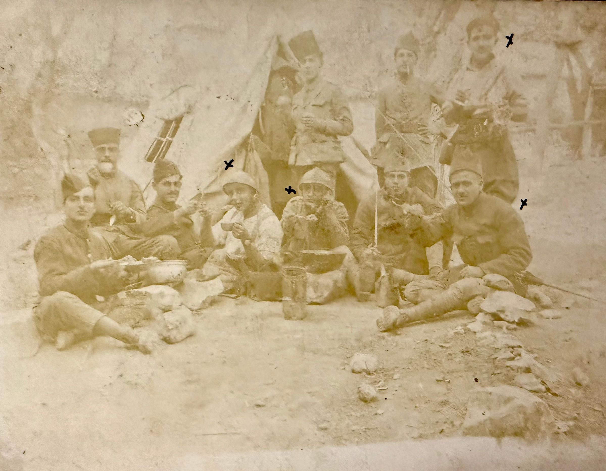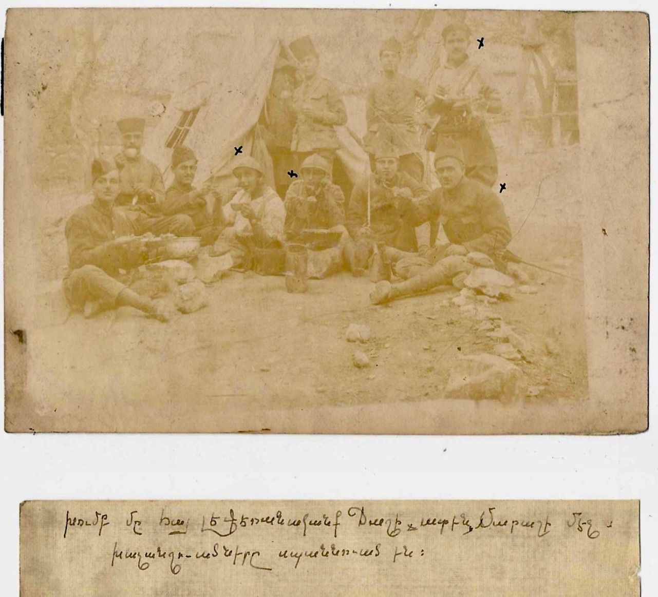 Written on a fragment of the original photo caption: “A group of Armenian legionnaires during lunch in Marash. The ones marked with crosses were killed in battle.”