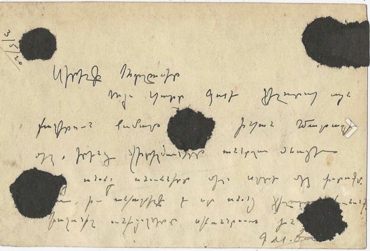 I gave this photograph as a keepsake in memory of those brave men who fell in Marash. Their graves remained [unmarked/unknown], [but] their names were engraved in our hearts, and it is impossible for their memory to [fade/be forgotten]. Those among them who bore the sign of the cross were martyred.