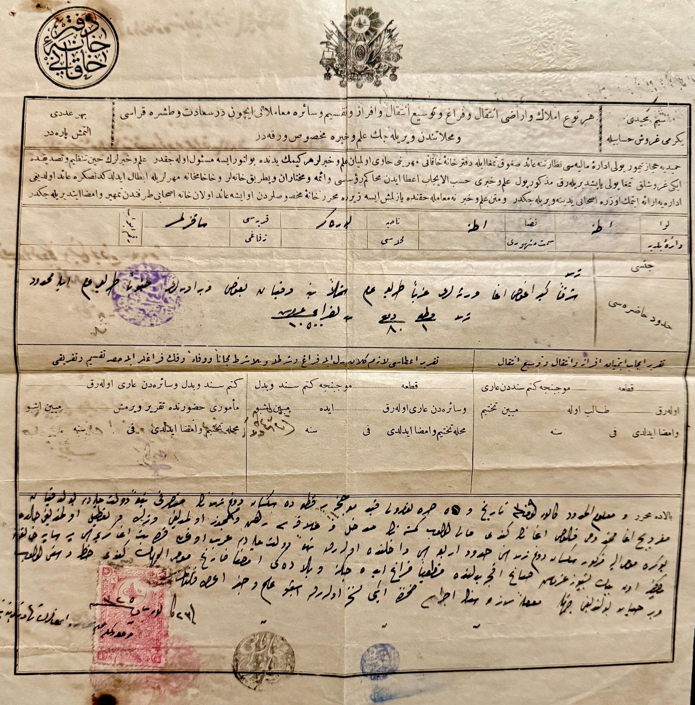 A 1909 document concerning the sale of a property in Yüreğir, Adana in the village of Sakızlı from Mıgırdıç Buldukyan Agha to Kalos Agha, his son.