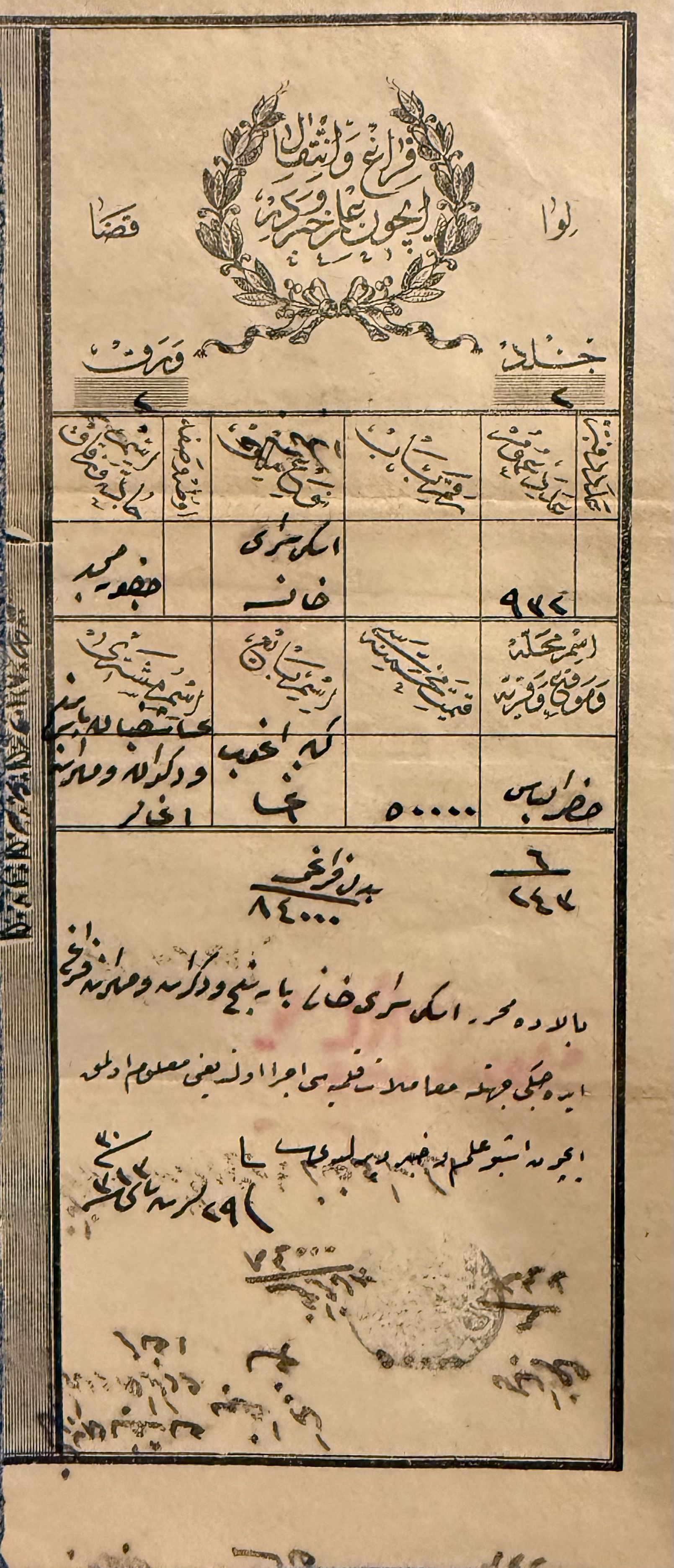 • Type: Ottoman property transfer certificate (Ferağ ve İntikal İlmuhaberi)