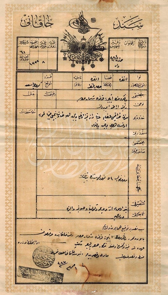 An Imperial Decree issued in 1327 (1911) concerning the registration of a vineyard located in Küçükesat (39.9083104, 32.8667197), owned by an Armenian—likely Armenian Catholic—named Peter, a resident of the Hisari Fukara neighborhood of Ankara. The decree records the transfer of this property to his heirs: Viçen, Gülbena, Sofya, Eliza, and Anna.General Notes