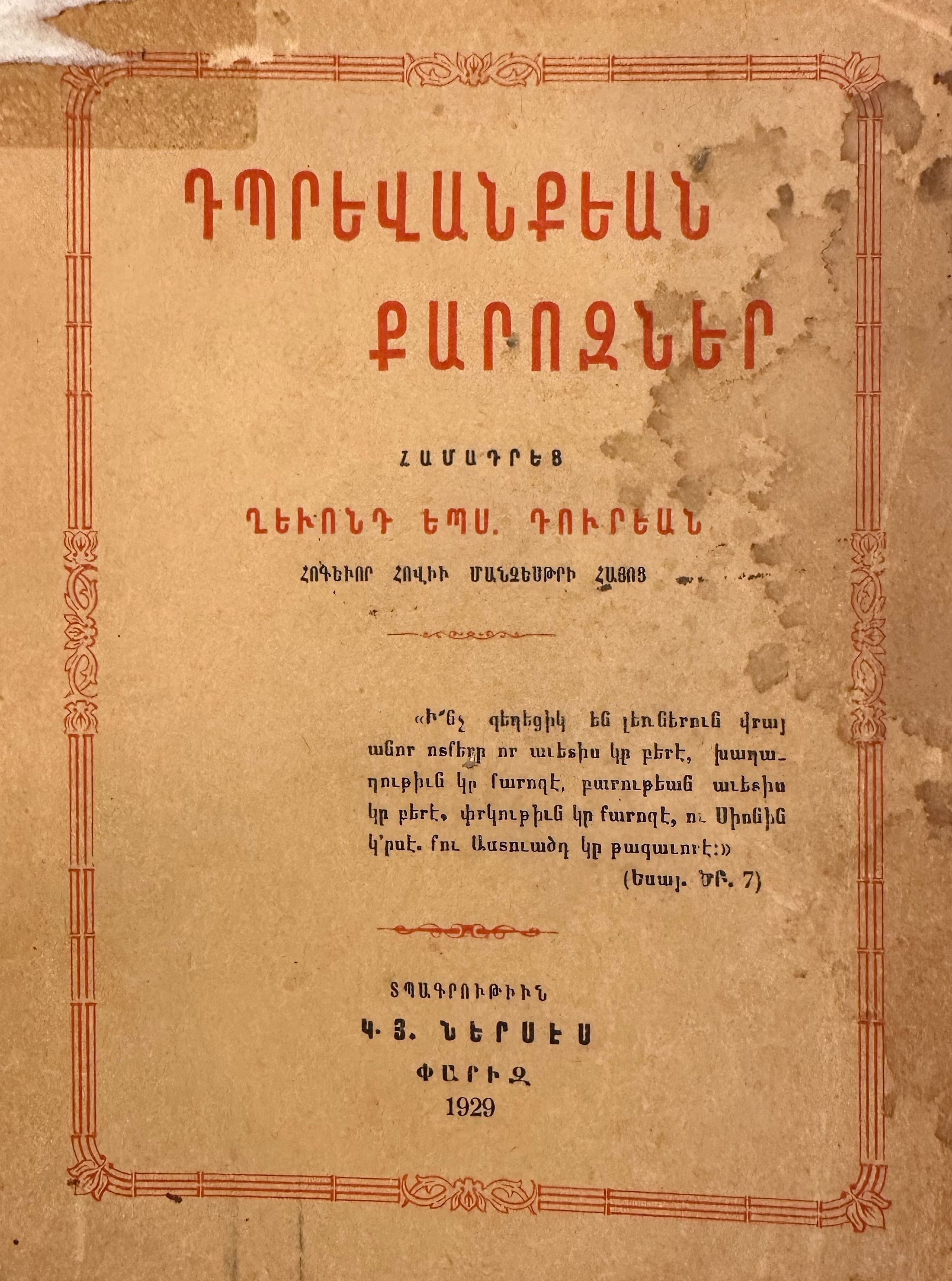 Tbrevankian Karozner (Ghevont Tourian, 1929)Description