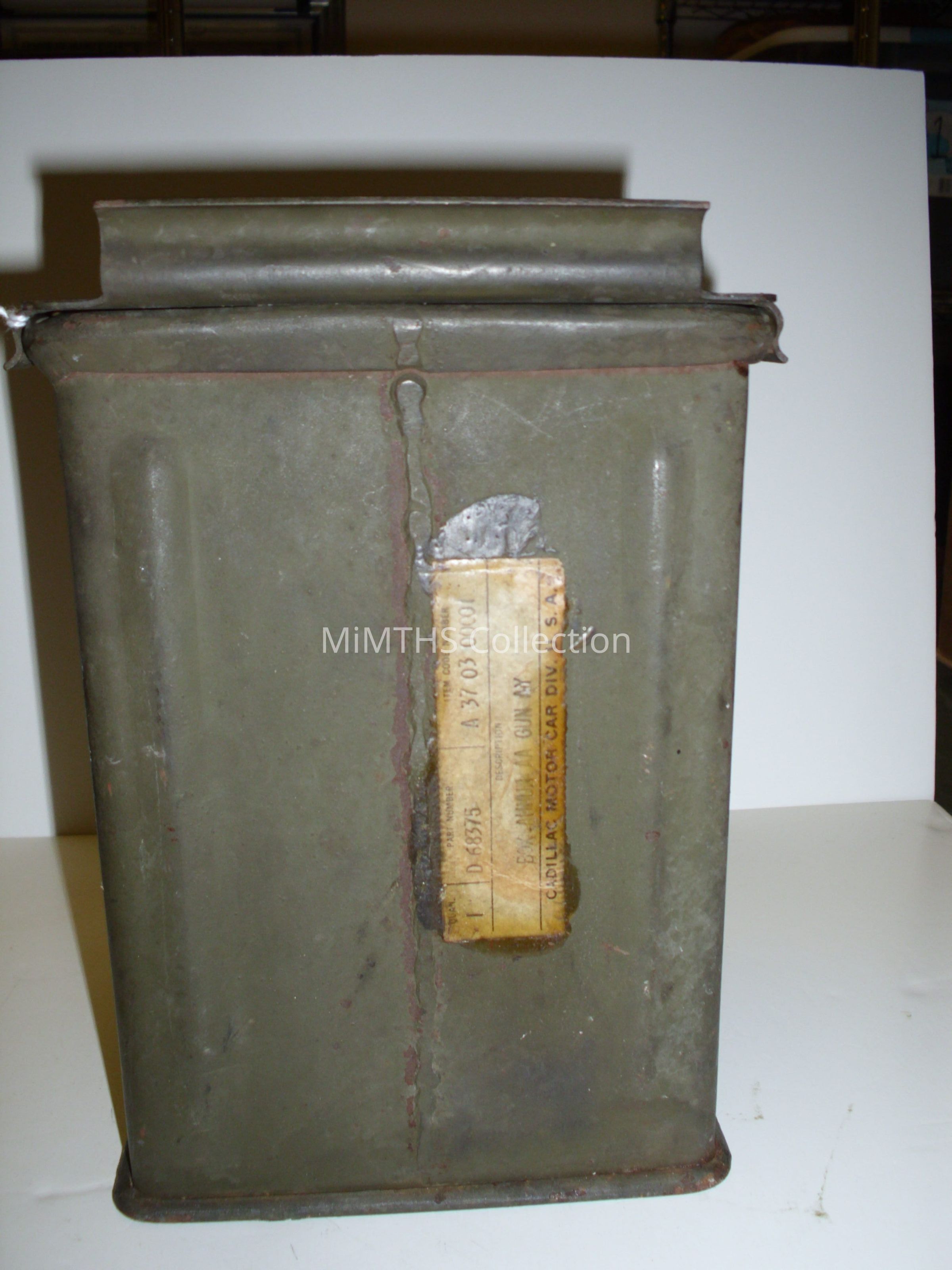 Ammo can for .50 cal made by Cadillac Motor car Div. Labeled "Box, Ammn AA Gun AY" part number D 68375 item code number A37 03 000001Cataloged By