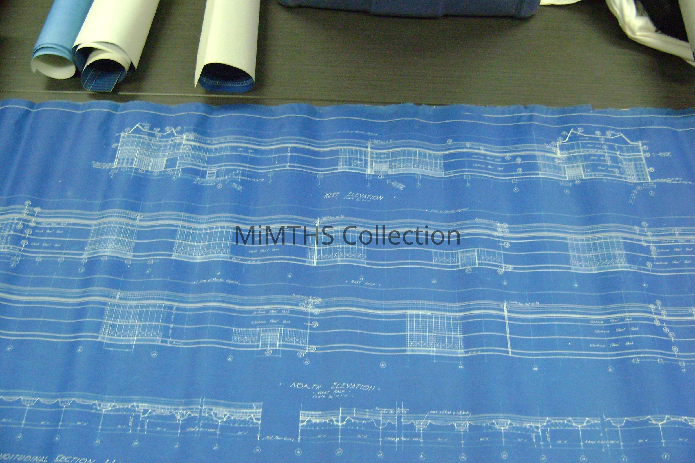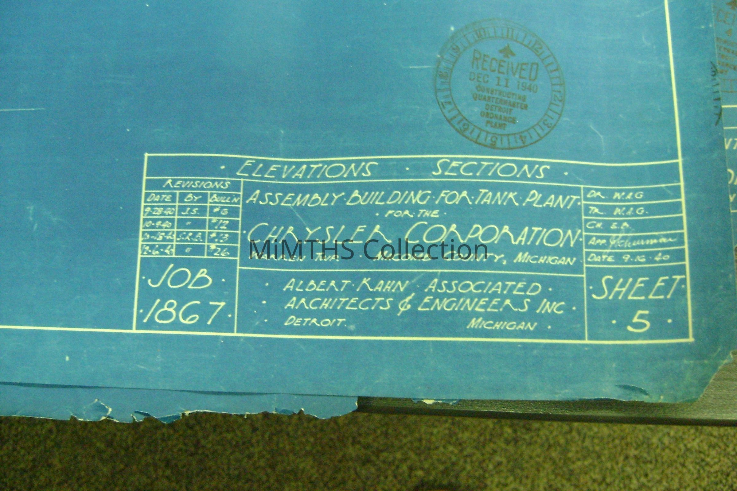 Set of blueprints from Albert Kahn Associated for the Chrysler Tank Plant. Nine drawings are 25"X56" two are 34"X17" and one 16"x24" hand drawn one. Drawing one is and overall site plan, two show east and west elevation, the rest are infrastructure drawings. Two smaller ones are production schedules.
