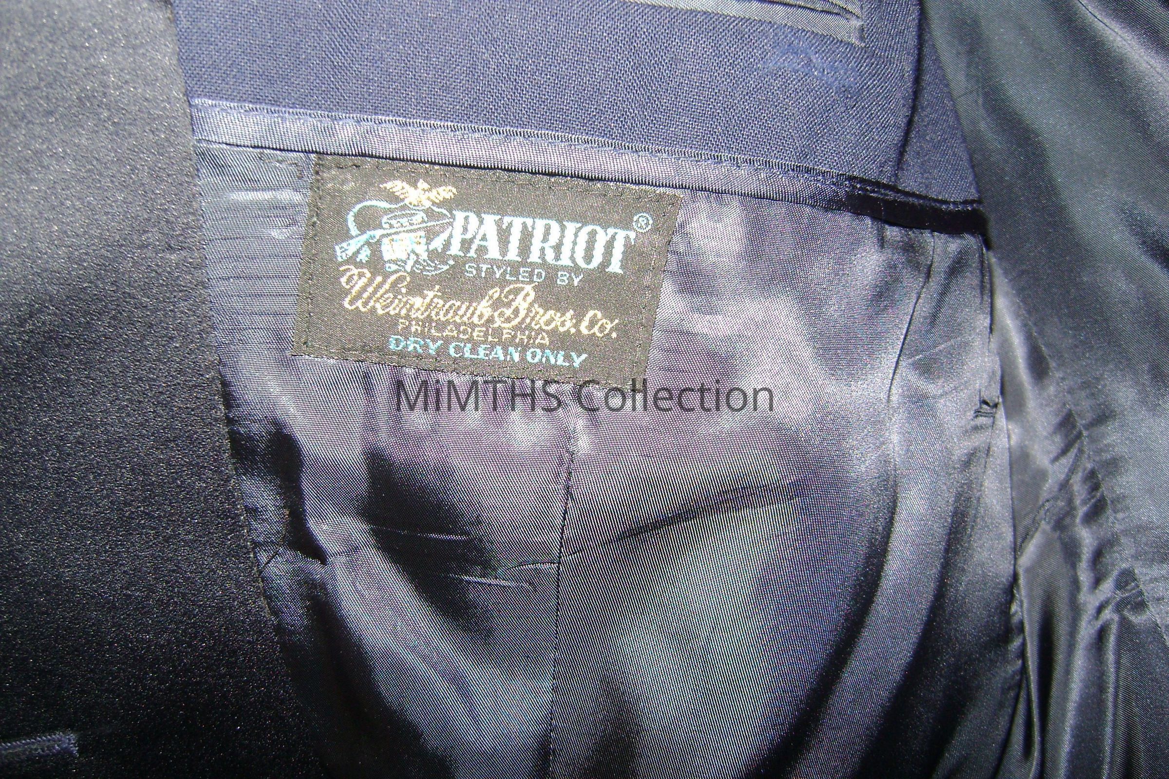 Air Force Formal dress uniform with insignia attached. On the inside is a patch nothing that the Jacket is of 'Patriot' brand by 'Weintraub Bro's Co.' of Philidelphia. It is 'Dry Clean Only'. The silk lining contains inside pockets.