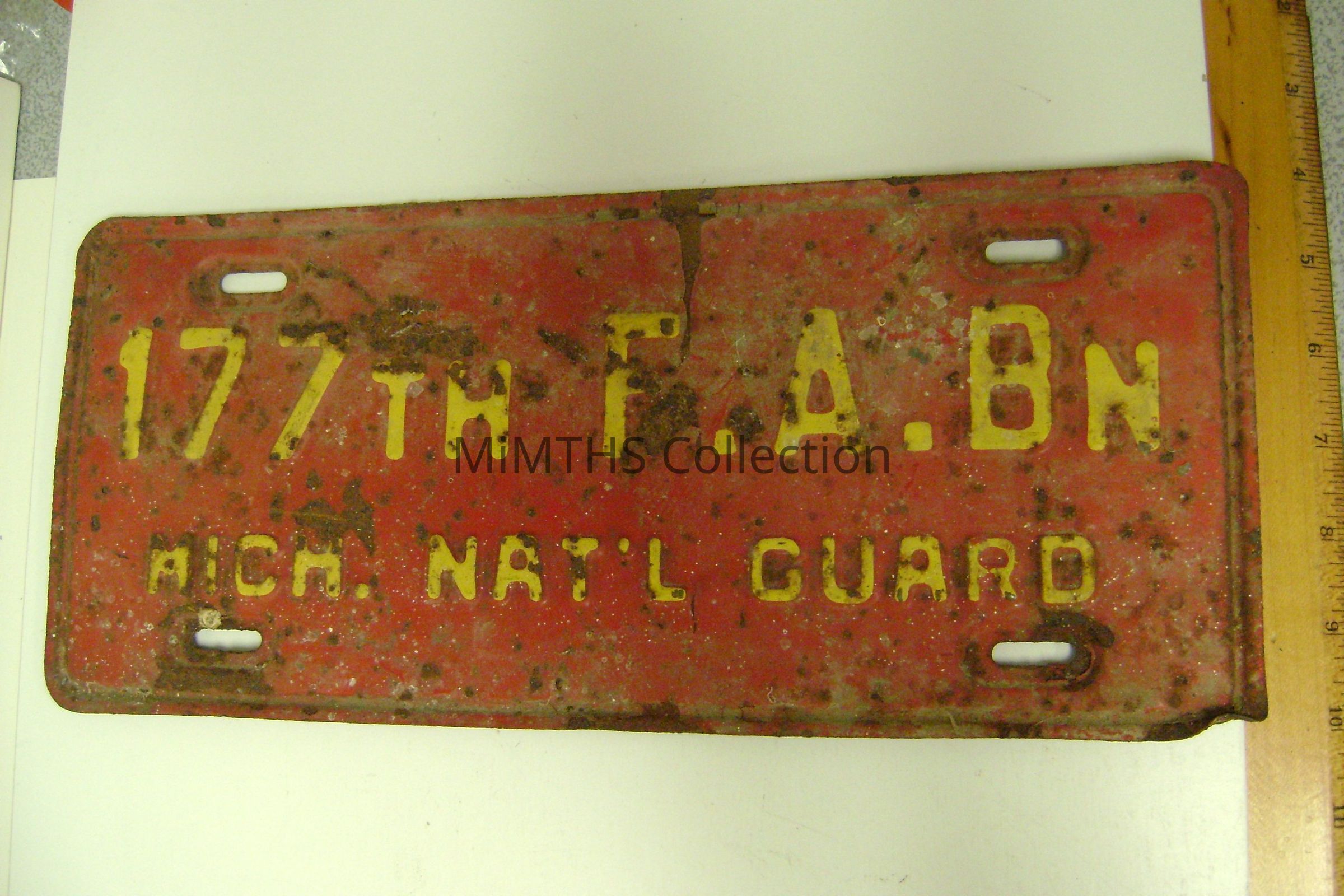 Red and yellow license plate from the 177th Field Artillery Battalion, Michigan National Guard.Cataloged By