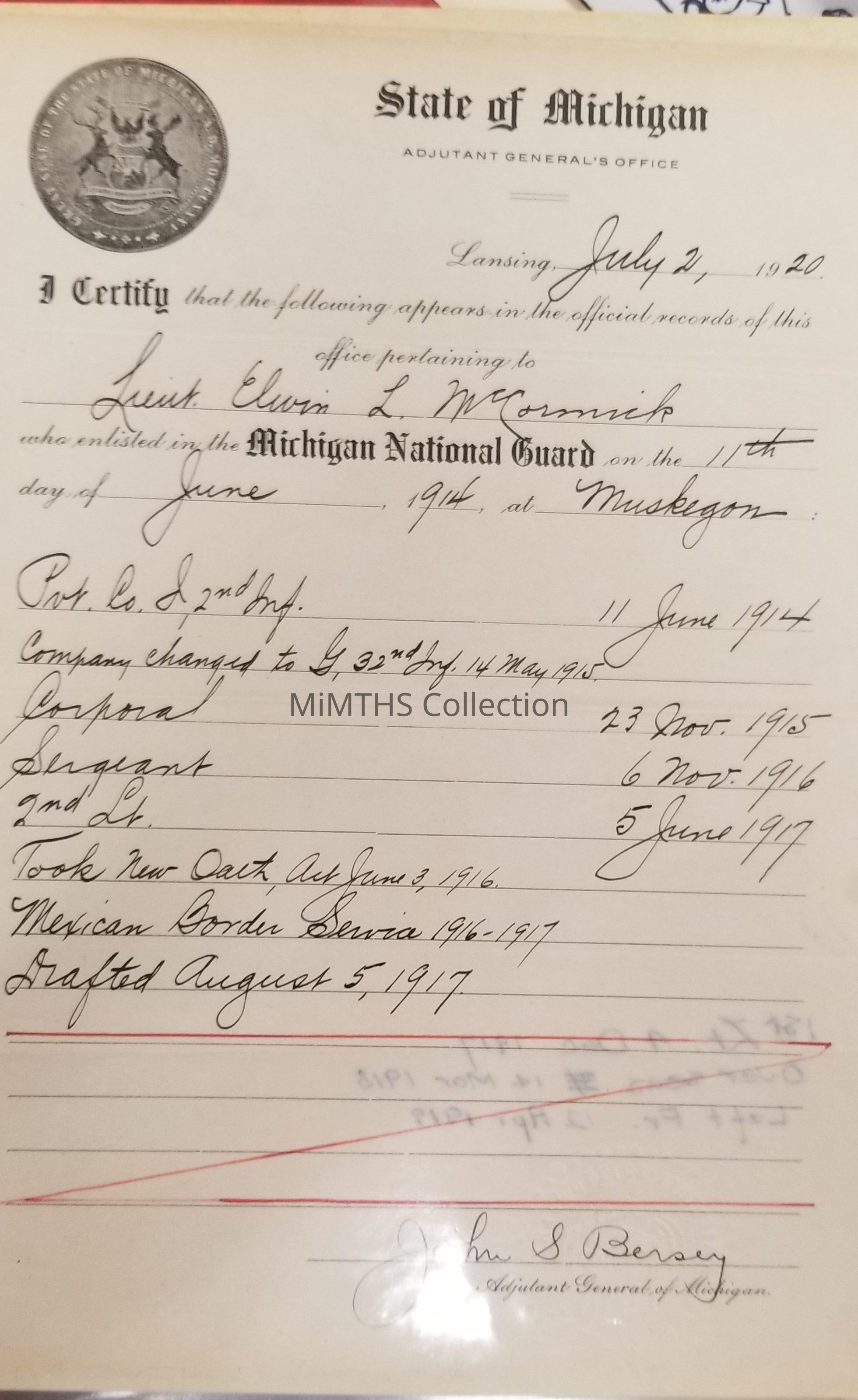 Service Records belonging to Elwin McCormick. Mostly WWI Includes receipt for replacement of purple heart, newspaper clippings of army songs, wwi payslips, memorandums, special orders, clippings dedicated to deceased friend Merrit U. Lamb, and WWI ID cardCataloged By