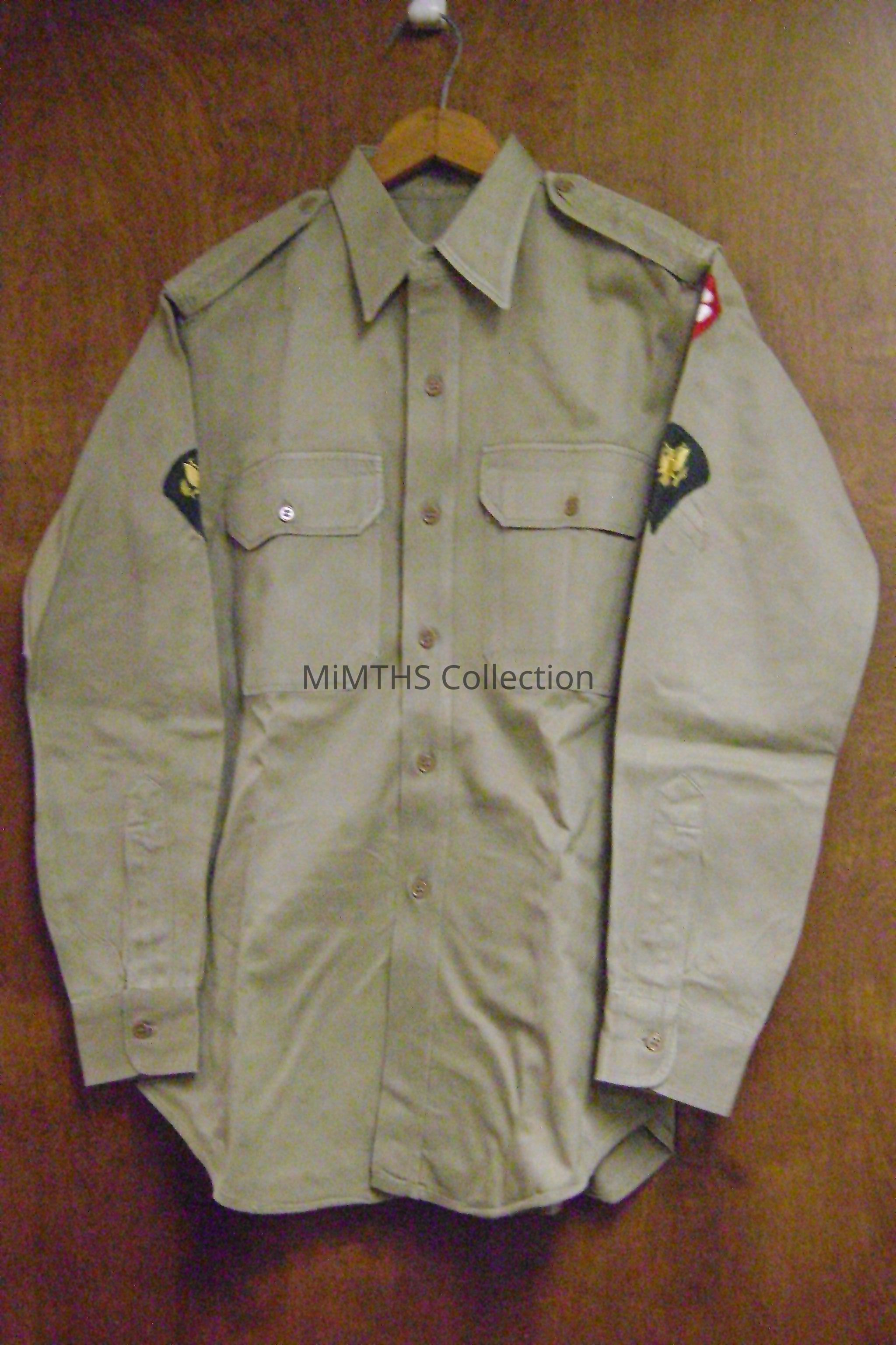 Dress shirt, 4th US army patches, belonged to Sgt. Kotulis. Size printed inside collar is 15 1/2 X 33.Cataloged By