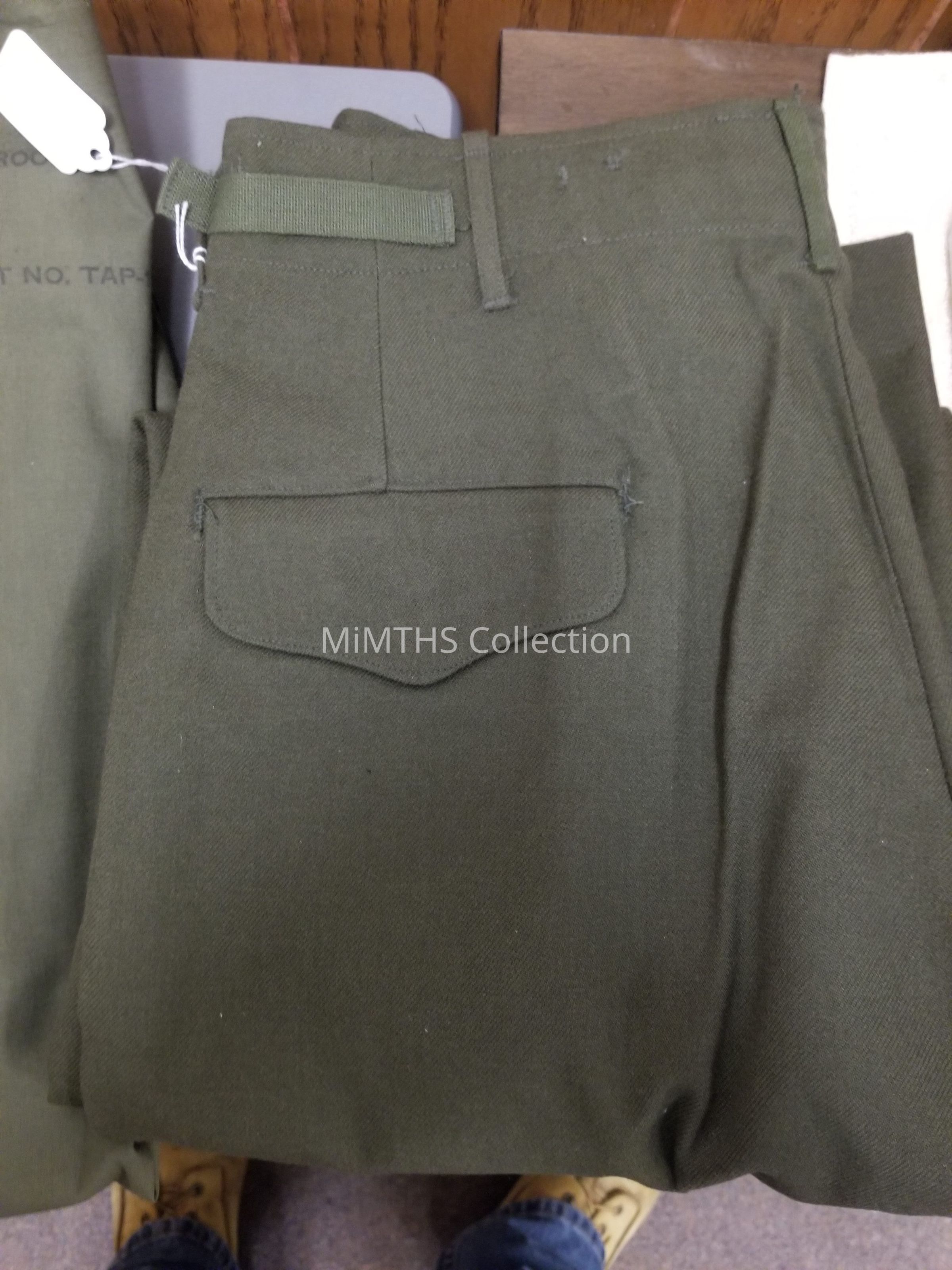 Green Army Dress pants worn by Sgt. Ron Kotulis of the 4th US Army. Size small, regular length. Inside lable instructs the user to wear over winter underwear and under troussers.Cataloged By