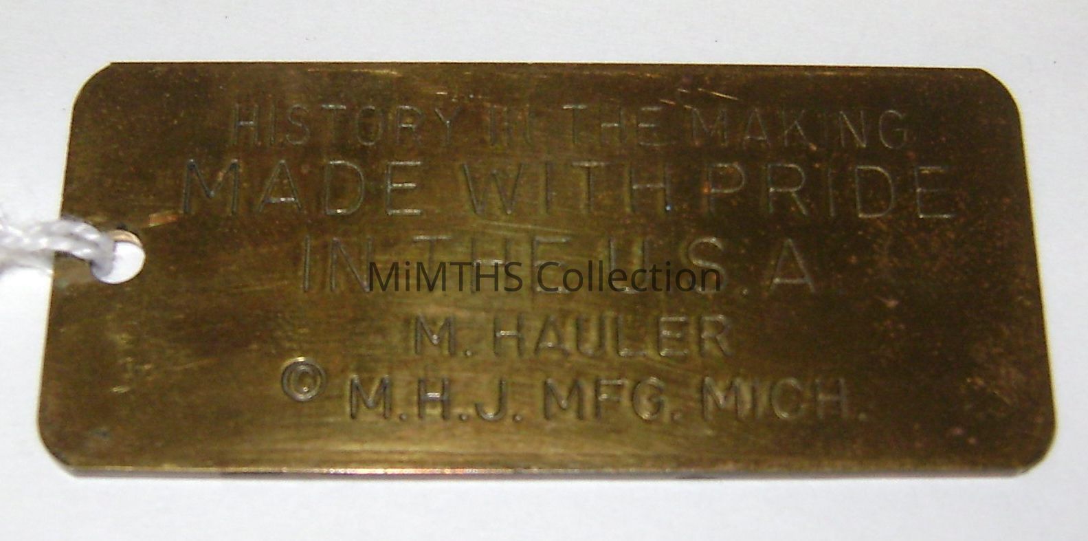 Approx 2"x1" brass finish tag, (probably a keychain?) from M.H.J MFG. of Michigan.