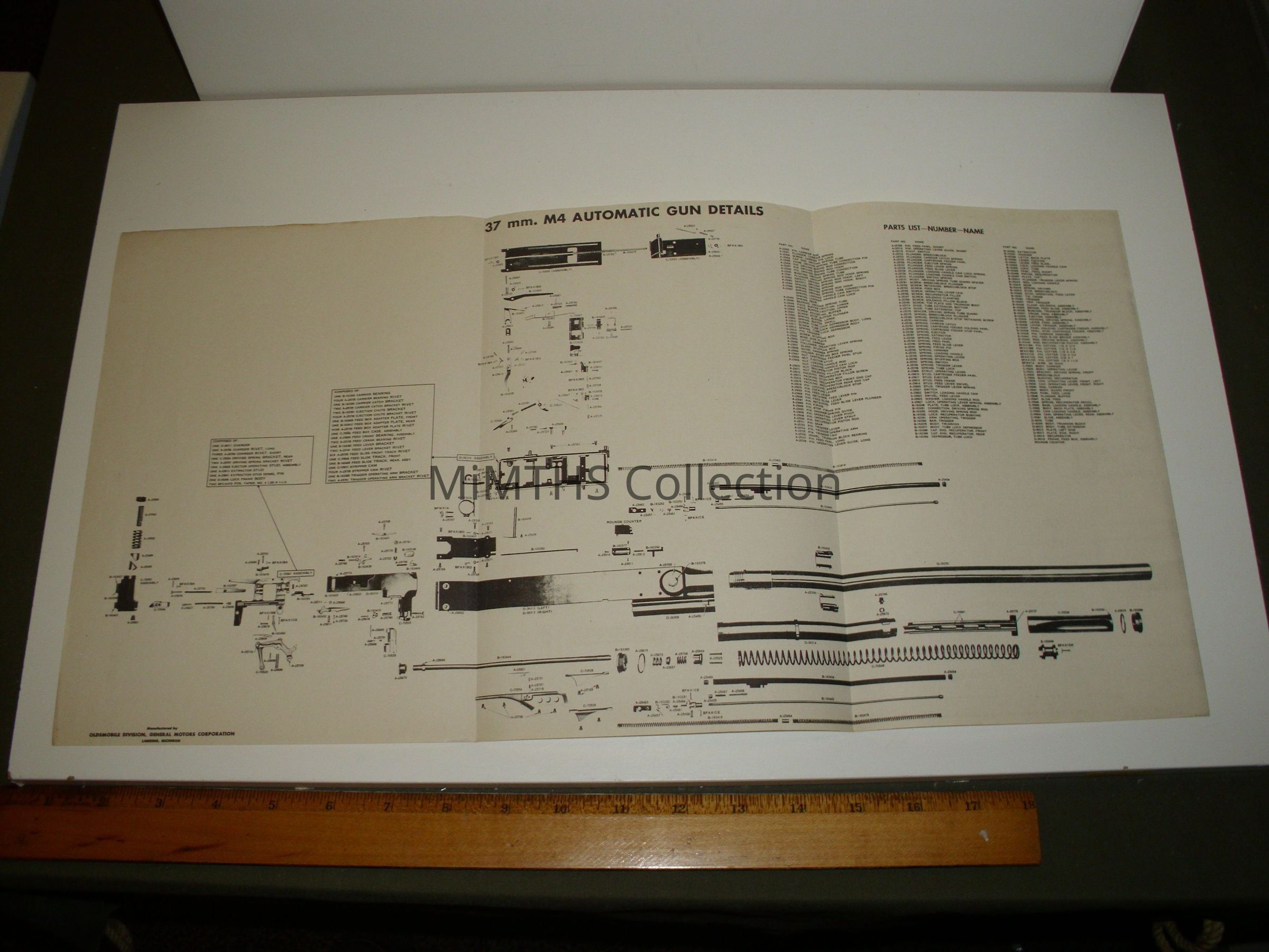 An exploded parts diagram of the 37mm M4 automatic gun. Produced in Lansing, Michigan by the Oldsmobile Division of the General Motors Corporation. The diagram lists all components along with corresponding part numbers. Measures 20x10.Cataloged By