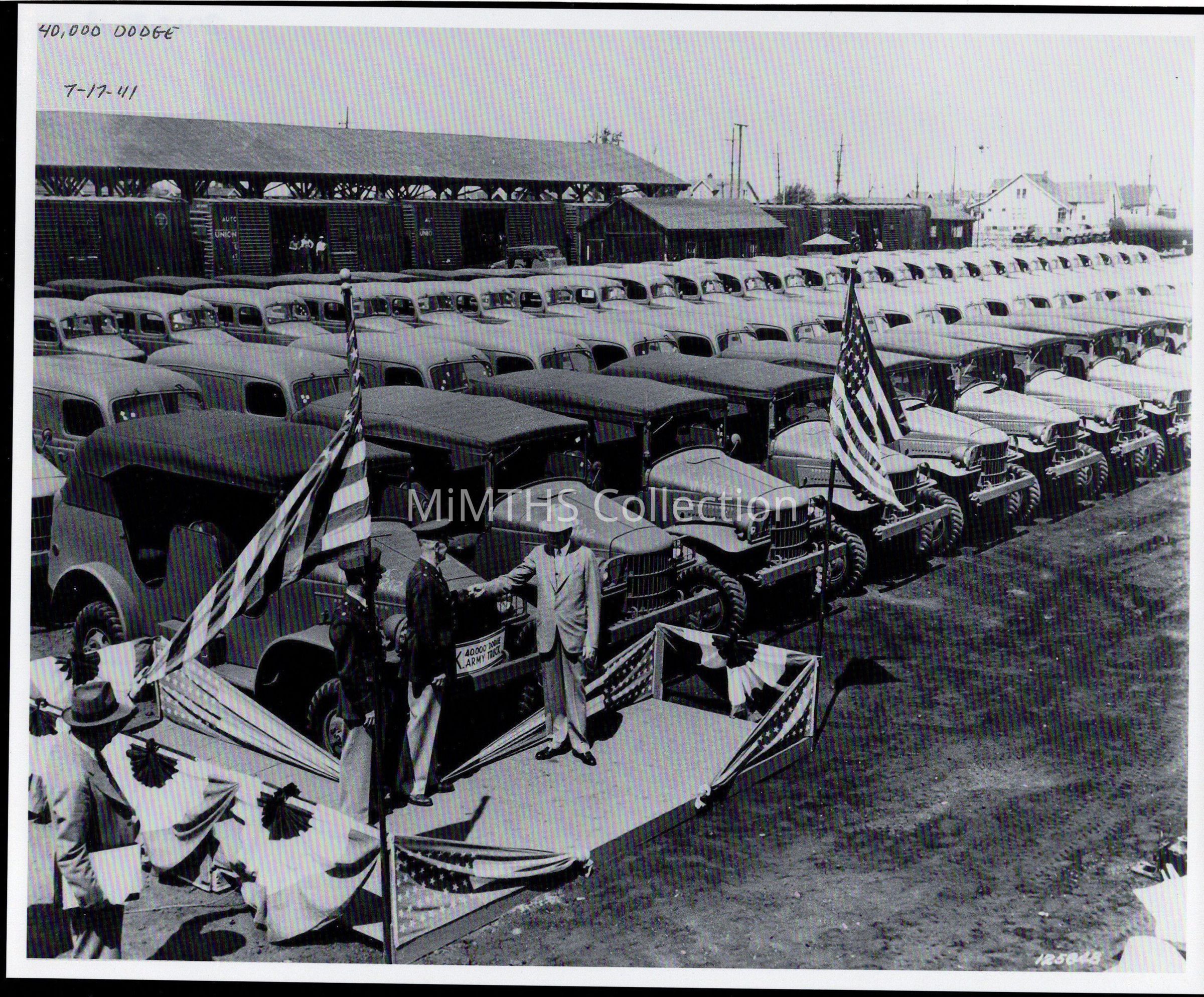 Photo of 40,000th truck delivered to the Army. Trucks are lined up one row of Command cars, one row of Panel trucks and one row of carryalls are visible.